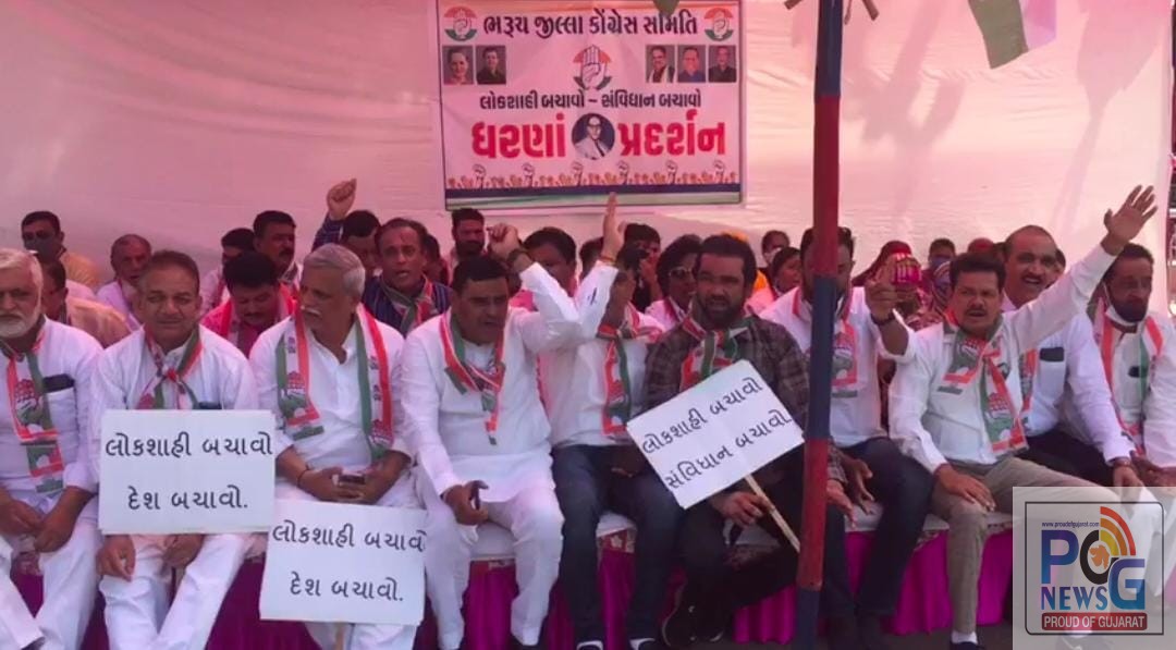 ભરૂચના સ્ટેશન સર્કલ પાસે આવેલ ડો.બાબા સાહેબ આંબેડકરની પ્રતિમા પાસે કોંગ્રેસના હોદ્દેદારો અને કાર્યકરો દ્વારા ધારાસભ્ય જીગ્નેશ મેવાણીની ધરપકડના વિરોધમાં “લોકશાહી બચાવ-સંવિધાન બચાવો” સાથે ધરણા પ્રદશન યોજી હાથમાં પ્લેકાર્ડ લઈ સરકાર વિરોધી સુત્રોચ્ચાર કરી વિરોધ પ્રદર્શન કર્યું હતું.