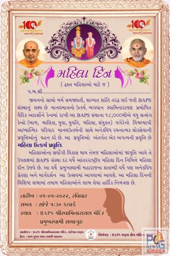 સમગ્ર વિશ્વમાં બીએપીએસ સ્વામિનારાયણ સંસ્થાઓ દ્વારા પ્રમુખ સ્વામી મહારાજ શતાબ્દી મહોત્સવ નિમિત્તે બીએપીએસ સંસ્થાના ૧૮ હજારથી વધુ સત્સંગ કેન્દ્રો ઉપર બાળ બાલિકા,યુવા યુવતી અને મહિલા સંયુક્ત વિગેરે વિશ્વ વ્યાપી આધ્યાત્મિક પરિવાર માનવ ઉતકર્ષની સાથે અનેક વિવિધ રચનાત્મક પ્રવુત્તિઓ અંગેનો કાર્યક્રમ યોજાયો હતો.જેમાં મહિલાઓમાં સર્વાંગી વિકાસ થયા અને મહિલાઓમાં જાગૃતિ આવે તે હેતુસર બીએપીએસ સંસ્થા મહિલા દિનની ઉજવણી કરે છે.આ વર્ષે પ્રમુખ સ્વામી મહારાજના શતાબધ્ધી વર્ષે પણ અનેક વિધ પ્રેરણા અને માર્ગદર્શન આ ઉત્સવમાં આપવામાં આવ્યા છે અને મહિલા દિનની વિશેષ્ટ સભામાં વિવિધ મહિલાઓએ વિવિધ સાંસ્કૃતિક કૃતિઓ તથા ભારતીય સંસ્કૃતિ કૃતિઓ રજૂ કરી ભારે આકર્ષણ જમાવ્યું હતું.જેમાં સંસ્થાની વિવિધ યુવતીઓ,મહિલાઓએ ઉત્સાહ અને ઉમંગ સાથે ભાગ લીધો હતો.