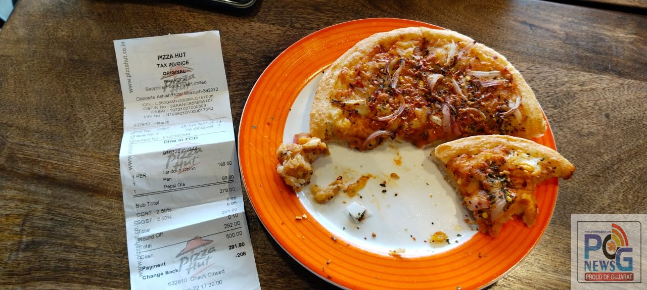 મંગળવારે સાંજે બનેલ આ ઘટનામાં અમદાવાદથી મિત્રને ભરૂચ મળવા આવેલ ગ્રાહક અતુલભાઇએ મિત્ર મનોજ્ભાઇને આવવાની વાર હોય પીઝા હટમાં બેસી રૂપિયા ચુકવી પીઝાનો ઓર્ડર આપ્યો હતો. જે પીઝા ટેબલ ઉપર સર્વ થતાં અતુલભાઇએ પીઝાનો એક ટુકડો ખાતા તેમના પીઝામાં કાચની ડીસનો તુકડો નીકળ્યો હતો. જેના કારણે તેમને મોઢામાંથી લોહી પણ નીકળ્યું હતું. આ મામલે ગ્રાહક અતુલભાઇએ પીઝા હટના મેનેજરને ફરીયાદ કરી તેમનું કિચન જોવા કહેતા મેનેજર ના કહેતા ગ્રાહક અતુલભાઇએ આ સમગ્ર મામલે પીઝા હટની મુખ્ય ઓફીસે ફરીયાદ કરવા સાથે રાજ્યના ફૂડ એન્ડ ડ્રગ્સ ડિપાર્ટમેન્ટ ભરૂચને ફરિયાદ કરી છે.