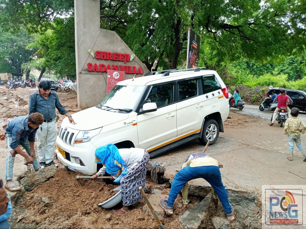 હાલ બિલ્ડરો દ્વારા મુખ્ય રોડની બાજુમાંથી જ વરસાદી પાણીના નિકાલ માટે અને ગટર વ્યવસ્થાના કામે 10 થી 12 ફૂટ ખાડો ખોદી નાંખતા વરસાદી મોસમમાં આસપાસના ગ્રામજનો, સોસાયટીના રહીશો, શાળા કોલેજોના વિધાર્થીઓ સહિતના માથે જોખમ ઉભું થયું છે અને આજે અનેક વાહન ચાલકો અટવાયા હતા.