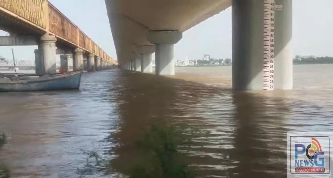 ભરૂચના ગોલ્ડન બ્રિજ ખાતે આજે સવારે સપ્તાહમાં બીજી વાર નર્મદા નદી તેની 24 ફૂટની ભયજનક સપાટી વટાવી 26 ફૂટ ઉપર વહેતી જોવા મળી હતી, નર્મદા નદીના જળસ્તર વધતા ભરૂચનું તંત્ર પણ એક્શન મોડમાં જોવા મળ્યું હતું, ભરૂચ, અંકલેશ્વરને જોડતા ગોલ્ડન બ્રિજને સલામતીના ભાગરૂપે બંધ કરવાની નોબત આવી છે. નદીમાં જળ સ્તર વધવાના કારણે લોકો ફોટા અથવા સેલ્ફી પડાવવા માટે ગોલ્ડન બ્રિજ ખાતે ઉમટી પડતા હતા જે બાદ આખરે બ્રિજને બીજી વખત બંધ કરવામાં આવ્યો છે.