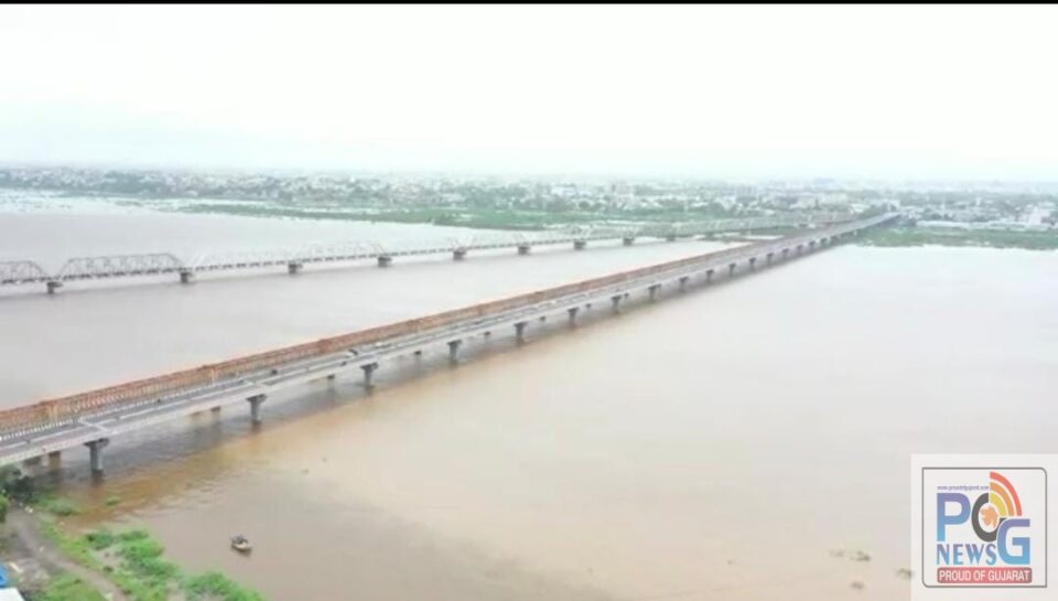 ઉપરવાસમાંથી વરસાદી માહોલ ના પગલે સરદાર સરોવર નર્મદા ડેમ માં સતત પાણીની આવક નોંધાઈ રહી છે,જેને પગલે ડેમ ની જળ સપાટી માં પણ ધરખમ વધારો થઇ રહ્યો છે,જે બાદ તંત્ર દ્વારા ડેમ ના તમામ ૨૩ દરવાજા ખોલી નર્મદા નદીમાં 2.50 લાખ ક્યૂસેક પાણી નર્મદા નદીમાં છોડવામાં આવી રહ્યું છે,નર્મદા નદીમાં છોડવામાં આવેલ પાણી ન પગલે ભરૂચ નજીક નર્મદા નદી ની જળ સપાટી માં વધુ એક વાર વધારો નોંધાયો છે,ભરૂચ ના ગોલ્ડન બ્રિજ ખાતે નર્મદા નદી ની જળ સપાટી રવિવારે સવારે ૧૮ ફૂટ આસપાસ પહોંચી હતી જે તેના ૨૨ ફૂટના વોર્નિંગ લેવલ થી માત્ર ૪ ફૂટ નીચે વહી રહી છે,