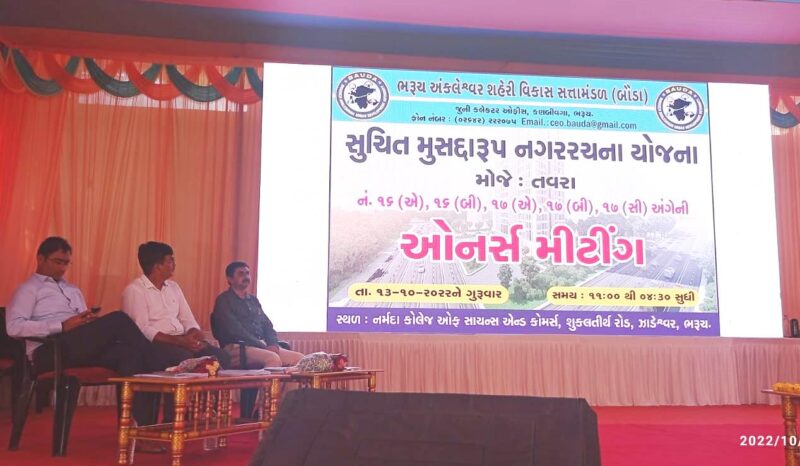 ભરૂચ-અંકલેશ્વર શહેરી વિસ્તાર વિકાસ સત્તા મંડળ(બૌડા) દ્વારા મોજે. તવરા ગામ વિસ્તારવાળી મુસદ્દારૂપ નગરયોજના રચના નં.૧૬-એ, ૧૬-બી, ૧૭-એ, ૧૭-બી અને ૧૭-સી સૂચિત મુસદ્દારૂપ યોજનાના સૂચિત આયોજનના જે તે હિત સબંધ ધરાવતા માલિકો સાથે ઓનર્સ મીટીંગનું આયોજન નર્મદા કોલેજ ઓફ સાયન્સ એન્ડ કોમર્સ ઝાડેશ્વર ખાતે વાગરાના ધારાસભ્ય અરૂણસિંહ રણા અને બૌડાના ચેરમેન અને જિલ્લા કલેક્ટરશ્રી તુષાર સુમેરાની પ્રેરક ઉપસ્થિતિમાં કરવામાં આવ્યું હતું. આ વેળાએ તવરા ગામ વિસ્તારની સૂચિત મુસદ્દારૂપ યોજનાના નકશાનું અનાવરણ પણ મહાનુભાવોના હસ્તે કરવામાં આવ્યું હતું.