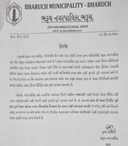 ભરૂચની તમામ ટાંકીઓ પરથી સમગ્ર વિસ્તારને દિવસમાં નિયત કરેલ એક સમયે સવાથી દોઢ કલાક પાણી આપવામાં આવશે તેમ પાલિકા પ્રમુખ, ચીફ ઓફિસર અને વોટર વર્ક્સના ચેરમેન દ્વારા સંયુક્ત રીતે જણાવાયું છે.