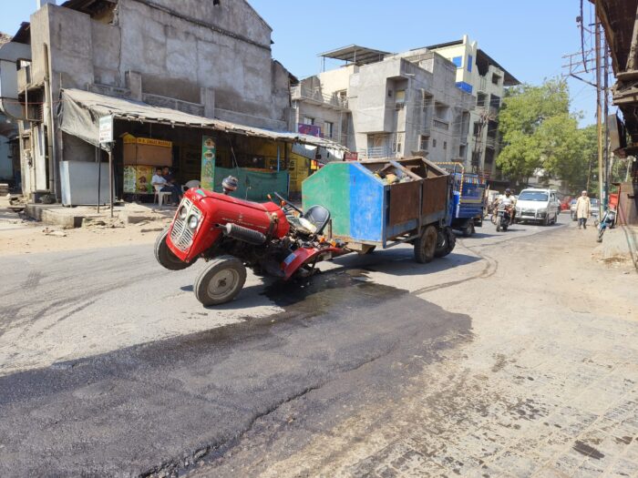 ભરૂચના મહંમદપુરા નજીક મદીના હોટલ પાસે આજે બપોરના સમયે પાલિકાનું ડોર ટુ ડોર સેવાનું એક ટ્રેકટરના આગળના ભાગનું ટાયર અચાનક છૂટું પડી જતા ટ્રેકટર રસ્તા વચ્ચે શિર્ષાશન અવસ્થામાં નજરે પડયુ હતું.