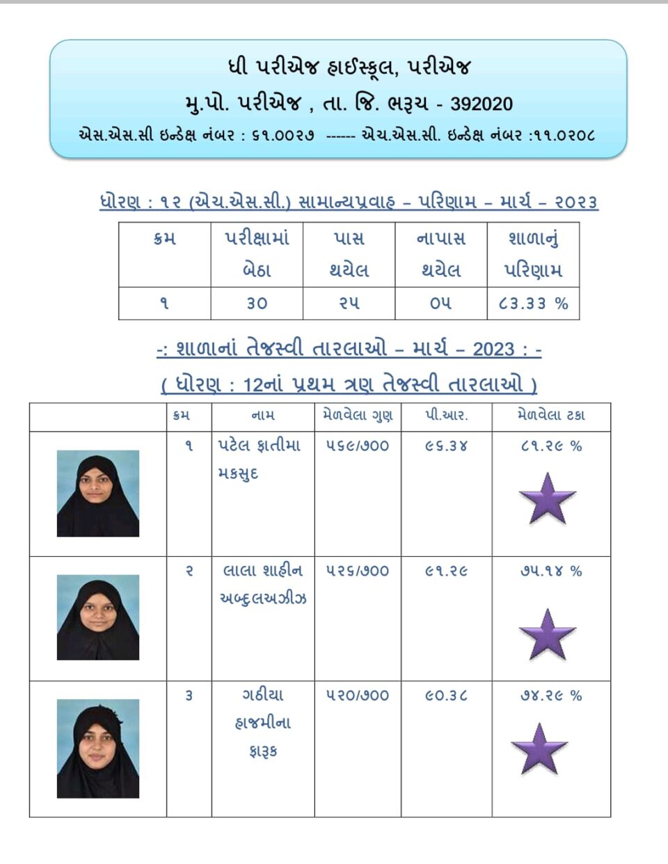ગુજરાત બોર્ડ દ્વારા માર્ચ મહિનામાં લેવાયેલ ધોરણ 12 સામાન્ય પ્રવાહની પરીક્ષામાં ભરૂચ જિલ્લાના પરીએજ ખાતે ધી પરીએજ હાઈસ્કૂલનું 83.33 ટકા પરિણામ આવ્યું છે. જેમાં ધોરણ 12 સામાન્ય પ્રવાહમાં અભ્યાસ કરતી પટેલ ફાતિમા મકસુદના પર્સન્ટાઈલ 96.34, પર્સન્ટેજ 81.29%, લાલા શાહીન અબ્દુલઅજીઝના પર્સન્ટાઈલ 91.29, પર્સન્ટેજ 75.14%, ગઠીયા હાજમીના ફારૂકના પર્સન્ટાઈલ 90.38, પર્સન્ટેજ 74.29% મેળવી ઉત્કૃષ્ટ દેખાવ કરી શાળાનું નામ રોશન કર્યું છે. શાળા પરિવાર દ્વારા ઉત્કૃષ્ટ દેખાવ કરનાર વિદ્યાર્થીઓને શુભેચ્છાઓ સાથે અભિનંદન પાઠવ્યા હતા.