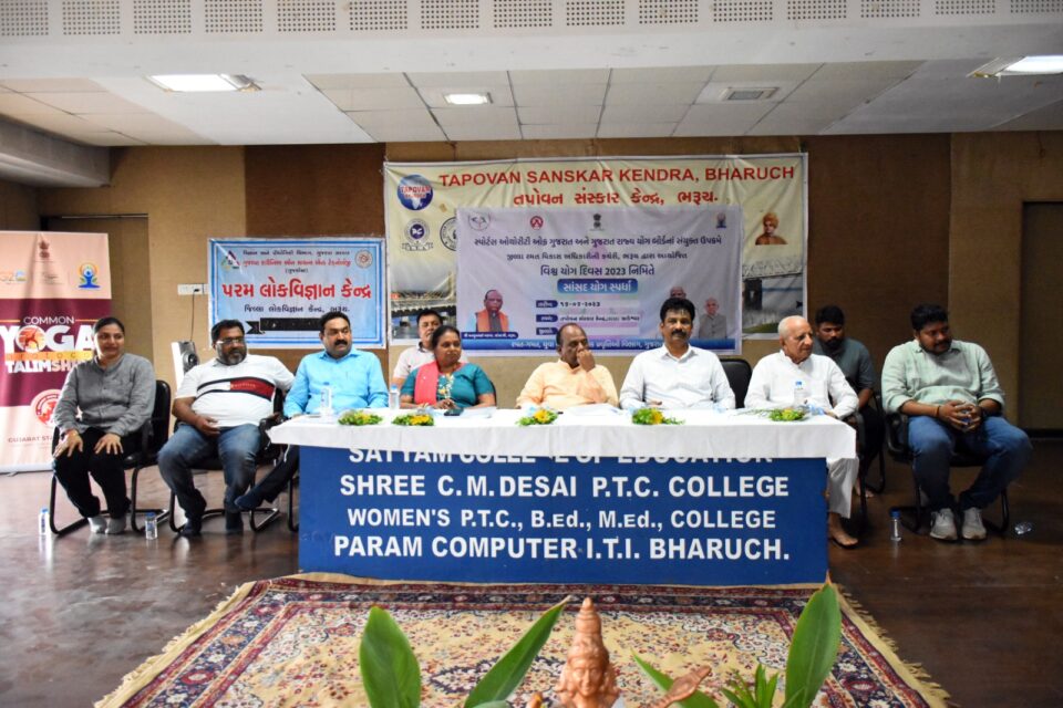 સ્પોર્ટ્સ ઓથોરીટી ઓફ ગુજરાત અને ગુજરાત રાજ્ય યોગ બોર્ડના સયુંકત ઉપક્રમે જિલ્લા રમત વિકાસ અધિકારીની કચેરી, ભરૂચ દ્વારા વિશ્વ યોગ દિવસ -૨૦૨૩ નિમિત્તે તપોવન સંસ્કાર કેન્દ્ર ખાતે સાંસદ યોગ સ્પર્ધાનું આયોજન કરવામાં આવ્યું હતું. કાર્યક્રમની શરૂઆત મહાનુભાવોના હસ્તે દીપ પ્રાગટ્ય થકી કરવામાં આવી હતી. આ પ્રસંગે મહાનુભાવોનું પુષ્પગુચ્છથી સ્વાગત કરવામાં આવ્યું હતું.