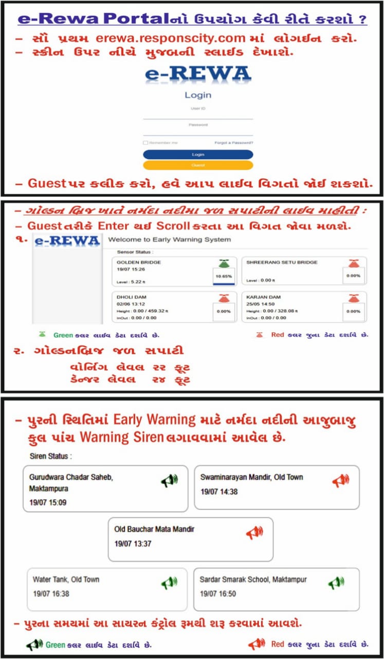 જિલ્લા વહીવટી તંત્ર દ્વારા વિક્સાવાયેલ E-Rewa પોર્ટલ erewa.responscity.com થી ગોલ્ડન બ્રિજ પર નર્મદા નદીનું જળસ્તર live જોઈ શકાશે. અસર પામનાર વિસ્તારો, ભરતીઓટની વિગતો તેમજ તંત્ર દ્વારા અપાતી એલર્ટ પણ જાણી શકાશે. ભરૂચના નાગરિકોને ચોમાસા દરમિયાન આ સુવિધા ઉપયોગ કરવા જિલ્લા કલેકટર તુષાર સુમેરાએ અપીલ કરી છે.
