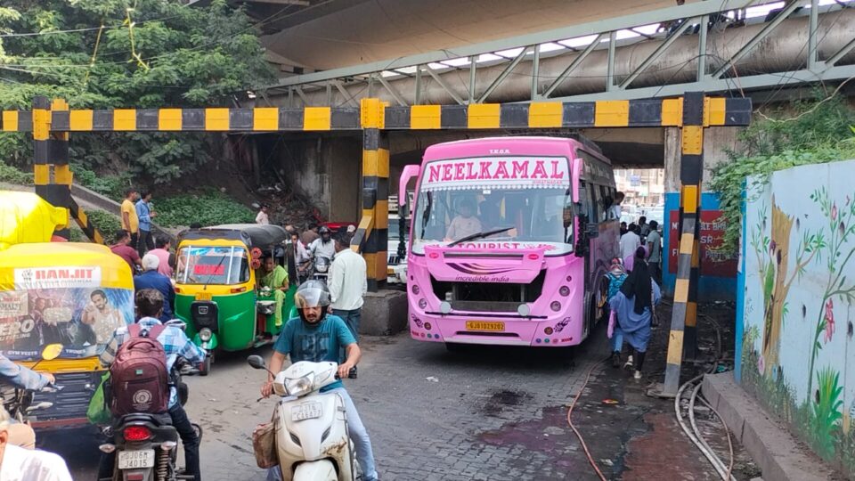 ભરૂચ કસક ગળનાળામાં લકઝરી બસ પ્રવેશી જતા ટ્રાફિક જામ સર્જાયો, ભારે જહેમત બાદ માર્ગ ખુલ્લો થયો