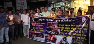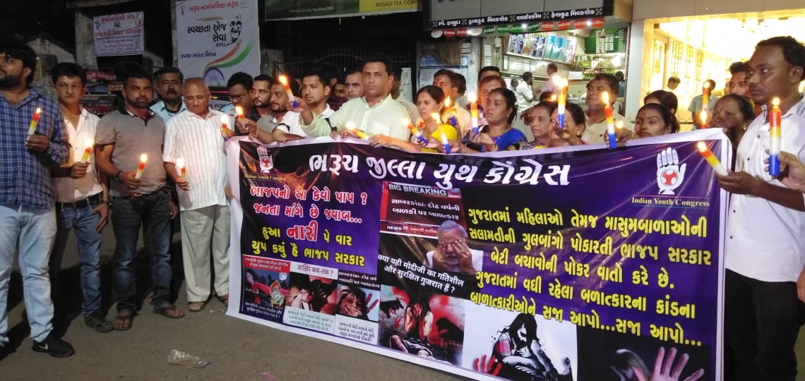 ગુુુજરાત માં વધતી જતી દુષ્કર્મ ની ઘટનાઓ અને એમાં પણ માસૂમ બાળાઓ ઉપર થતા બળાત્કાર ના કિસ્સા ઓ પ્રકાશ માં આવ્યા બાદ આજ રોજ ભરૂચ જિલ્લા યુથ કોંગ્રેસ દ્વારા કાળી પટ્ટી ધારણ કરી કેન્ડલ માર્ચ યોજી બળાત્કારીઓ ને સખત માં સખત કાર્યવાહી થાય તેવી માંગ ઉચ્ચારી હતી.
