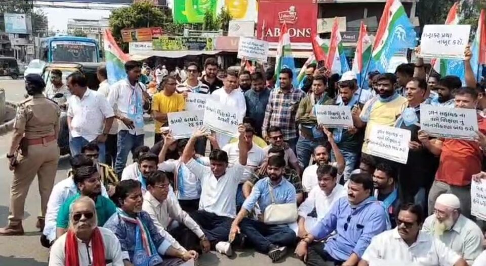 NSUI આક્રમક-જ્ઞાન સહાયક યોજના (કોન્ટ્રાકટ આધારિત ભરતી)રદ કરી કાયમી શિક્ષકોની ભરતી કરવા માટે ભરૂચ NSUI દ્વારા શિક્ષણ બચાવો વિરોધ પ્રદર્શન યોજાયું