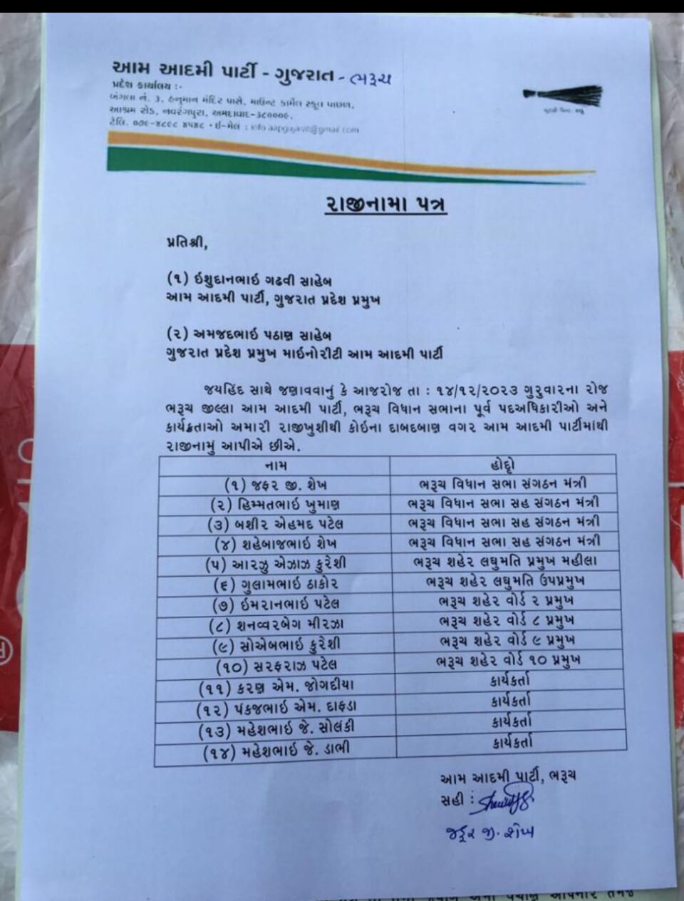 આગામી સમયનાં નજીકના ભવિષ્યમાં લોકસભાની ચૂંટણીઓ યોજાવા જઈ રહી છે તેવા સમયે ભરૂચ આમ આદમી પાર્ટીમાં મોટાપાયે ભંગાણ સર્જાતા ભરૂચનું રાજકારણ ગરમાયુ છે. આમ આદમી પાર્ટીના 43 જેટલા હોદ્દેદારો અને કાર્યકર્તાઓએ સત્તાવાર રીતે રાજીનામા ધરી દેતા ભરૂચના રાજકારણમાં ચહલપહલ મચી જવા પામી છે પ્રાપ્ત વિગતો અનુસાર ભરૂચ વિધાનસભામાં મત વિસ્તારમાંથી પાર્ટીના ભરૂચ વિધાનસભાના સંગઠન મંત્રી ઝફર જી શેખ દ્વારા આમ આદમી પાર્ટીના લેટરપેડ ઉપર આપના હોદ્દેદારો અને કાર્યકર્તાઓના નામ હોદ્દા સહિતનો રાજીનામાં લેટર ગુજરાત પ્રદેશ અધ્યક્ષ ઈશુદાન ગઢવી ને સંબોધી લખેલ છે, જેમાં 43 જેટલા હોદ્દેદારો તારીખ 14 12 23 થી આમ આદમી પાર્ટીમાંથી ખુશીથી અને કોઈના દાબદબાણ વગર રાજીનામા આપીએ છીએ તે મતલબનો લેખિતમાં લેટર લખેલ છે, પરંતુ રાજીનામા આપવાનું કારણ હજી સત્તાવાર રીતે બહાર પડેલ નથી, કહેવાય છે કે પક્ષના આંતરિક ડખા એટલી બધી ચરમસીમાએ પહોંચ્યા કે આમ આદમી પાર્ટીમાંથી એક સાથે 43 જેટલા કાર્યકર્તાઓ અને હોદ્દેદારોને રાજીનામું આપવાની ફરજ પડી છે