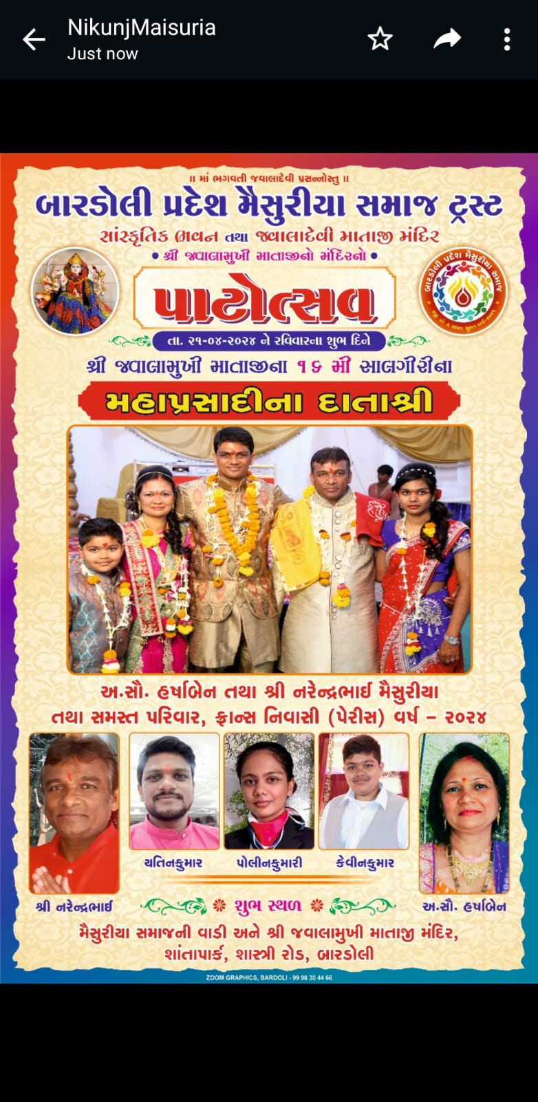 બારડોલી પ્રદેશ મૈસુરિયા સમાજ ટ્રસ્ટ દ્વારા જવાળામુખી માતાજી મંદિર નો 16મી સાલગીરી મહોત્સવ 21/4/24 રવિવારે ભવ્ય ઉજવણી કરવામાં આવશે.