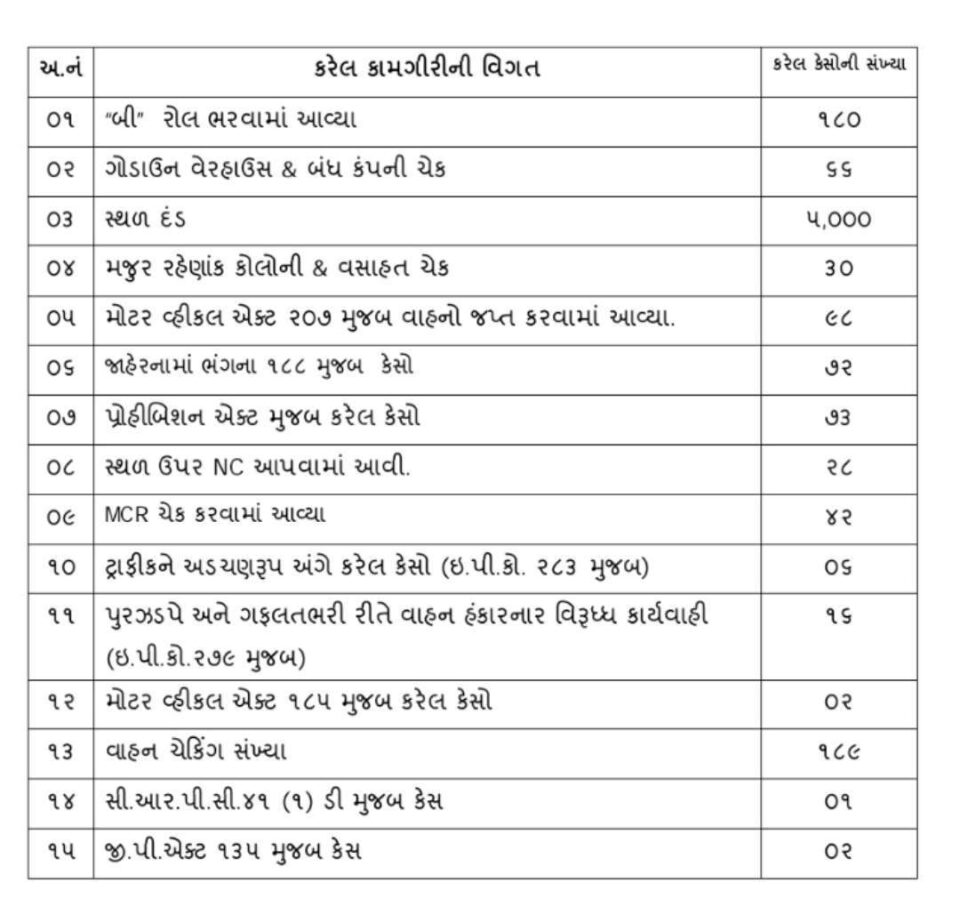 ભરૂચ જિલ્લા પોલીસ વડા મયુર ચાવડા ના માર્ગદર્શન હેઠળ કાયદો અને વ્યવસ્થા સમગ્ર જિલ્લામાં જળવાઈ રહે તે માટે અંકલેશ્વર જંબુસર દહેજ ઝઘડિયા પાનેલી સહિતના જીઆઇડીસી વિસ્તારોમાં પોલીસ ચેકપોસ્ટ બનાવી કોમ્બિંગ કામગીરી હાથ ધરવામાં આવી હતી જિલ્લા પોલીસ વડાના માર્ગદર્શન મુજબ અલગ અલગ ટીમ બનાવી અસામાજિક પ્રવૃત્તિઓને ડામવા માટે તથા વાહન ચેકિંગ કરી સ્પેશિયલ ઓપરેશન કોડ સહિતની વિવિધ પોલીસ ટુકડીઓ તૈયાર કરી કામગીરી યોજાઈ હતી જેમાં 5000 થી વધુ આસામીઓ પાસેથી સ્થળ પર જ દંડની વસુલાત પોલીસ દ્વારા કરવામાં આવી હતી તેમજ અંદાજિત 1000 થી વધુ લોકો પાસેથી ગોડાઉન એન્ડ વેરહાઉસ મોટર વ્હીકલ એક્ટ પ્રોહિબિશન એક્ટ જીપીએટ સીઆરપીસી એક્ટ સહિતના ભરૂચની આસપાસના વિસ્તારમાં 6,000 થી વધુ લોકો પાસેથી પોલીસ દ્વારા જુદા જુદા પ્રકારનો દંડ વસૂલ કરવામાં આવ્યો હતો