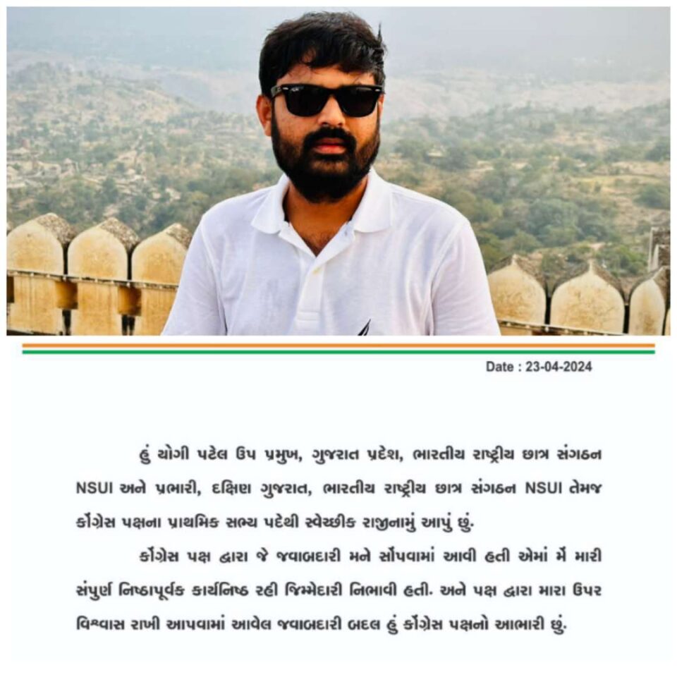 ગુજરાત પ્રદેશ NSUI ઉપ પ્રમુખ યોગી પટેલે તમામ સભ્ય પદે થી રાજીનામુ ધર્યું
