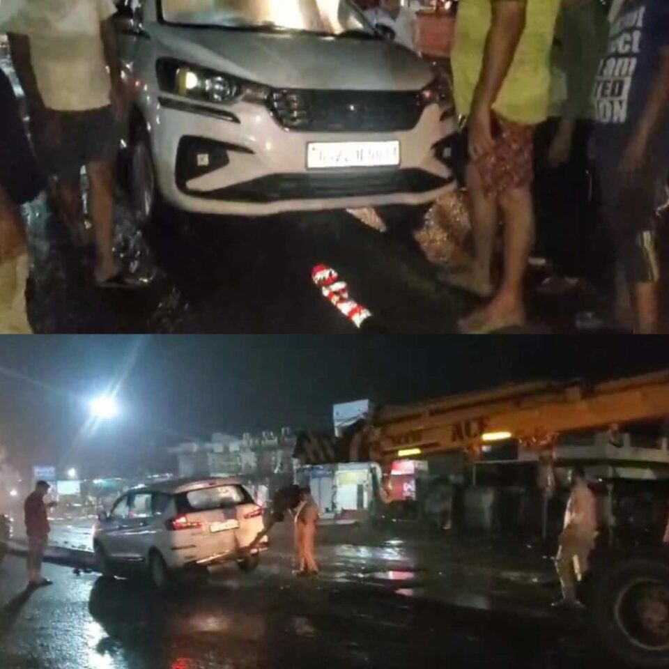 અર્ટિકા કારને ક્રેનની મદદથી નીચે ઉતરી ડીવાઈડર ઉપરથી રોડ પર લવાઈ