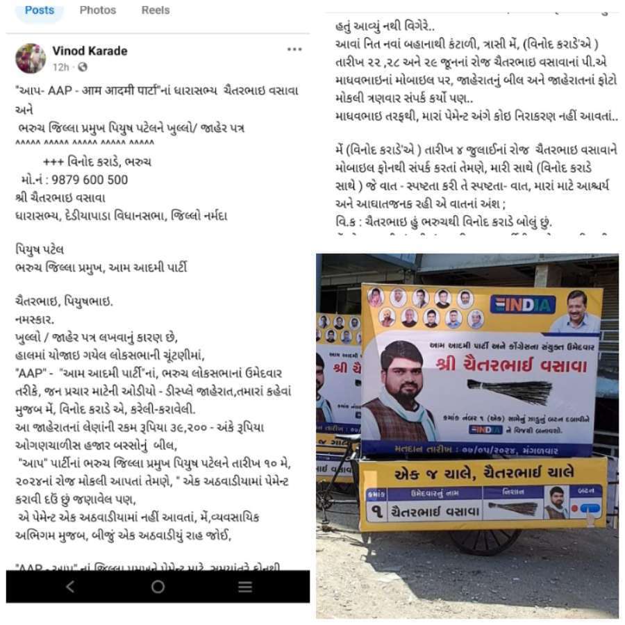 ચૂંટણી નું મતદાન સમાપ્ત થયું, પરિણામ આવી ગયું પરંતુ વિનોદભાઈ જેવા પ્રચાર પ્રસાર અને જાહેરાત ના વ્યવસાય કર્તા વ્યક્તિ એ આજે પણ ચૈતર વસાવા અને આપ ના જિલ્લા પ્રમુખ પિયુષ પટેલ પાસે તેઓના બાકી નીકળતુ મહેનતાણું 39 હજાર ઉપરાંત ની રકમ માટે પોતાની ચંપલ ઘસવા નો વારો આવ્યો છૅ,