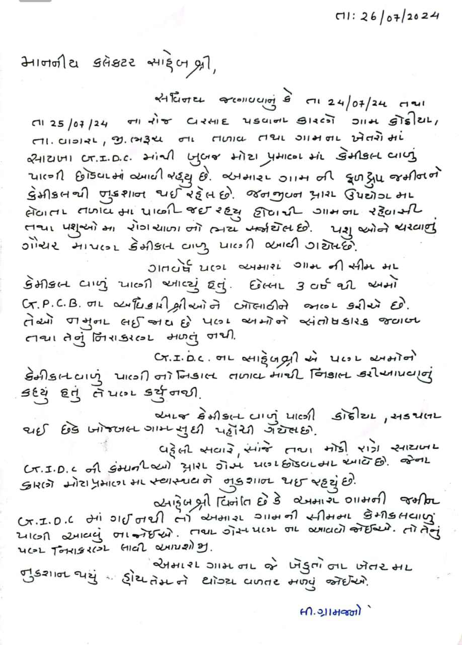 કોઠીયા ગામના રહેવાસીઓ અને ખેડૂતો દ્વારા આજે એકત્ર થઈ ભરૂચ જિલ્લા કલેકટર સમક્ષ ઘણા લાંબા સમયથી જીઆઇડીસી સાઈખા દ્વારા છોડવામાં આવતું હોય આ કેમિકલ યુક્ત પાણી કોઠીયા ગામના ખેડૂતોના ખેતર સુધી પહોંચી ગયું હોય જેના કારણે ખેતીમાં લેવામાં આવતા પાકને ભારે નુકસાની થયું હોવાનો આક્ષેપ આ લેખિત પત્રમાં કોઠીયા ગામના ખેડૂતોએ કર્યો છે ઉપરાંત કોઝવે અને તળાવમાં પણ કેમિકલ યુક્ત પાણીનો ભરાવો થતા કોઠીયા ગામમાં સામાન્ય પ્રજાને કેમિકલ યુક્ત પાણી વચ્ચે કેવી રીતે રહેવું તે સહિતના પ્રશ્નો સર્જાયા છે? કોઠીયા ગામના રહેવાસીઓનું કહેવું છે કે છેલ્લા ત્રણ વર્ષથી આ સમસ્યાનો સામનો અમો કરી રહ્યા છીએ અવારનવાર gpcb ના અધિકારીઓને પણ જાણ કરવામાં આવે છે પરંતુ તેઓ દ્વારા કેમિકલ યુક્ત પાણીના માત્ર નમુના લઈ સંતોષ માની લેવામાં આવે છે, આથી આજે કોઠીયા ગામના રહેવાસીઓ દ્વારા કલેક્ટર સમક્ષ લેખિત પત્ર પાઠવી નિયમિત સવાર સાંજ આવતા કેમિકલ યુક્ત પાણીના કોઠીયા ગામમાં નિકાલથી ગ્રામજનો ત્રાહિમામ પોકારી ઊઠ્યા છે આથી આ સમસ્યાનું આગામી સમયમાં યોગ્ય નિરાકરણ લાવવામાં આવે તેવી માંગ કરી છે.