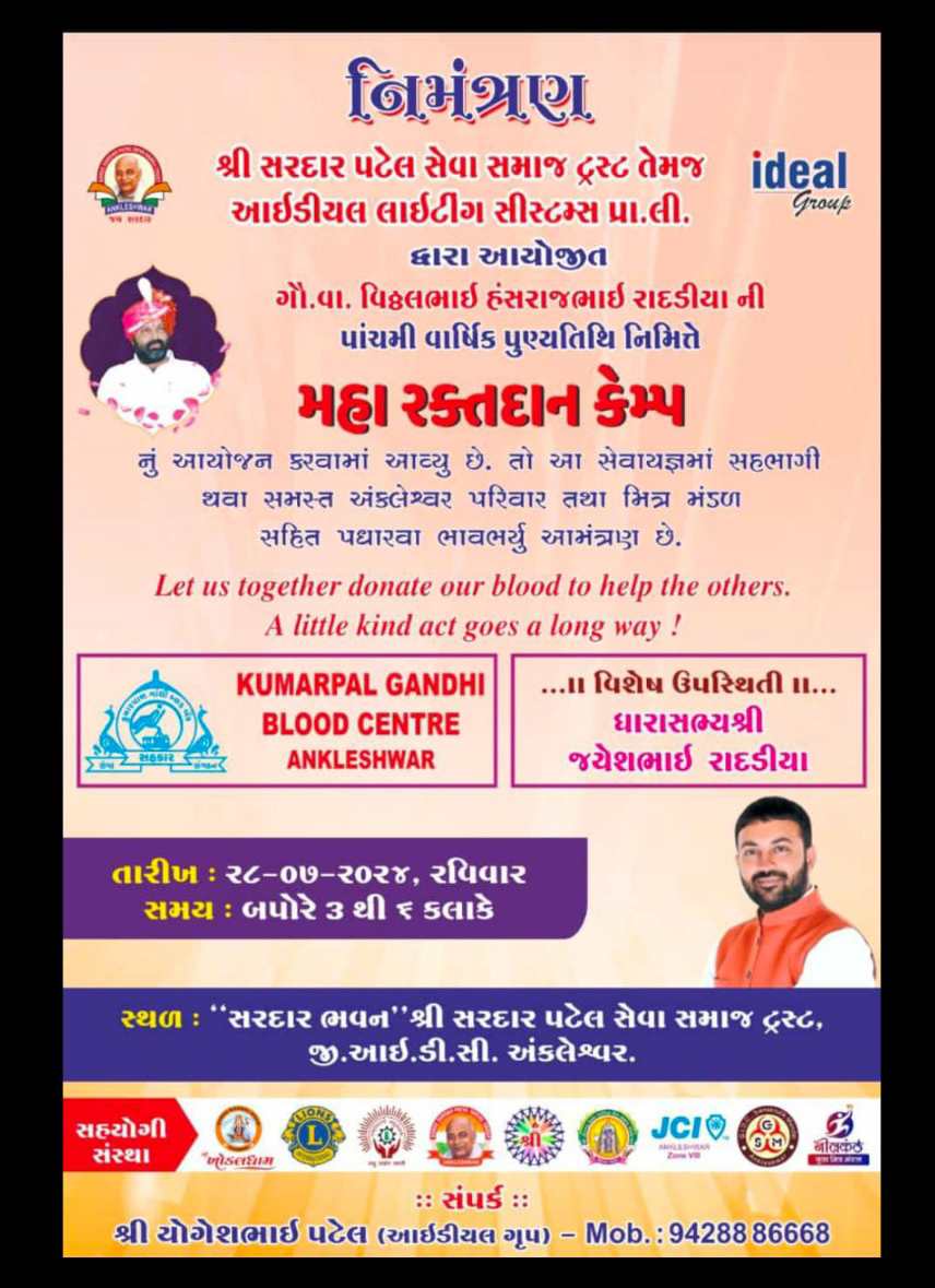 અંકલેશ્વરમાં શ્રી સરદાર પટેલ સેવા સમાજ ટ્રસ્ટ તથા આઇડિયલ લાઇટિંગ સિસ્ટમ પ્રાઇવેટ લિમિટેડ દ્વારા આવતીકાલે તારીખ 28/ 7/ 2024 ને રવિવારે બપોરે 3:00 થી સાંજે 6:00 વાગ્યા સુધી સરદાર ભવન શ્રી સરદાર પટેલ સેવા સમાજ ટ્રસ્ટ જીઆઇડીસી અંકલેશ્વર ખાતે ગૌ.વા. વિઠ્ઠલભાઈ હંસરાજભાઈ રાદડિયા ની પાંચમી વાર્ષિક પુણ્યતિથિ નિમિત્તે મહારક્તદાન કેમ્પનું આયોજન કરવામાં આવ્યું છે, આ બ્લડ ડોનેશન કેમ્પમાં ધારાસભ્ય જયેશભાઈ રાદડિયા વિશેષ ઉપસ્થિત રહેશે આથી સર્વે અંકલેશ્વર વિસ્તારના રહેવાસીઓને બહોળા પ્રમાણમાં આ મહારક્તદાન કેમ્પમાં સહભાગી થઈ સમસ્ત પરિવાર તથા મિત્ર મંડળ સહિત ઉપસ્થિત રહેવા માટે આયોજકો દ્વારા નિમંત્રણ પાઠવવામાં આવ્યું છે.