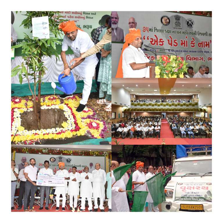 ભરૂચ- સોમવાર જે.પી.આર્ટસ અને સાયન્સ કોલેજ ભરૂચ ખાતે ૭પમાં જિલ્લાકક્ષાના વનમહોત્સવની ઉજવણીમાન. રાજયકક્ષાના મંત્રી વન અને પર્યાવરણ ક્લાઈમેટ ચેન્જ જળ સંપત્તિ અને પાણી પુરવઠા, ગુજરાત મંત્રીશ્રી મુકેશભાઈ અધ્યક્ષપદે કરવામાં આવી હતી.