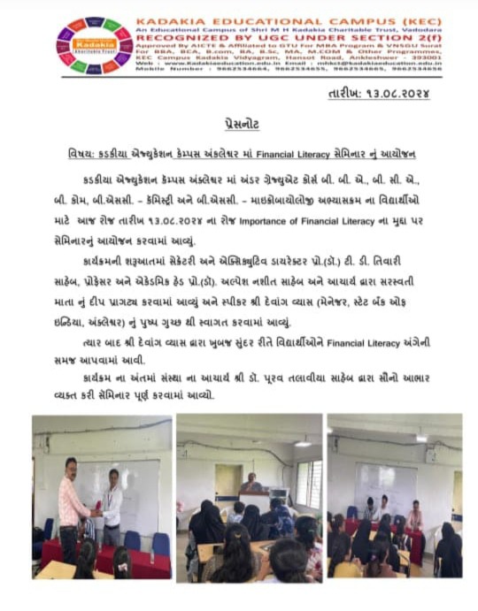 અંકલેશ્વર ખાતે આવેલ કડકિયા એજ્યુકેશન કેમ્પસમાં શૈક્ષણિક શ્રેષ્ઠીઓની ઉપસ્થિતિમાં એક માર્ગદર્શક ફાઇનાન્સ લિટ્રેસી વિશે વિદ્યાર્થીઓ માટે આયોજન કરવામાં આવ્યું હતું , આ કાર્યક્રમની શરૂઆત દીપ પ્રગતાવાથી કરવામાં આવી હતી, આ સેમિનારમાં મુખ્ય વિષય ઈમ્પોર્ટન્સ ઓફ ફાઇનાન્સ લિટ્રેસીના મુદ્દા પર શૈક્ષણિક જગતના વિવિધ આગેવાનોએ વિદ્યાર્થીઓને માર્ગદર્શન પૂરું પાડ્યું હતું, ફાઇનાન્સ લિટ્રેસી વિશે state bank of india અંકલેશ્વરના મેનેજર દેવાંગ વ્યાસ દ્વારા વિદ્યાર્થીઓને માહિતગાર કરવામાં આવ્યા હતા finance લીટ્રેસી સેમિનારમાં કડકિયા એજ્યુકેશન કેમ્પસના અંડર ગ્રેજ્યુએટ વિદ્યાર્થીઓ બીકોમ બીએસસી કેમેસ્ટ્રી સહિતના વિદ્યાર્થીઓએ આ સેમિનારનો બહોળા પ્રમાણમાં લાભ લીધો હતો કાર્યક્રમના અંતમાં સંસ્થાના આચાર્ય ડો. પુરવ તલાવીયા એ શ્રેષ્ઠિઓને આ પ્રકારનો સેમિનાર કરવા બદલ સરાહના કરી હતી.
