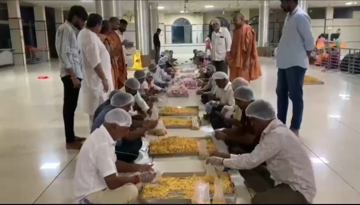 વડતાલ મંદિરમાં સ્વયંસેવકોની ટીમ ભોજન પ્રસાદના પેકેટની તૈયારી કરી રહી રહ્યા છે.