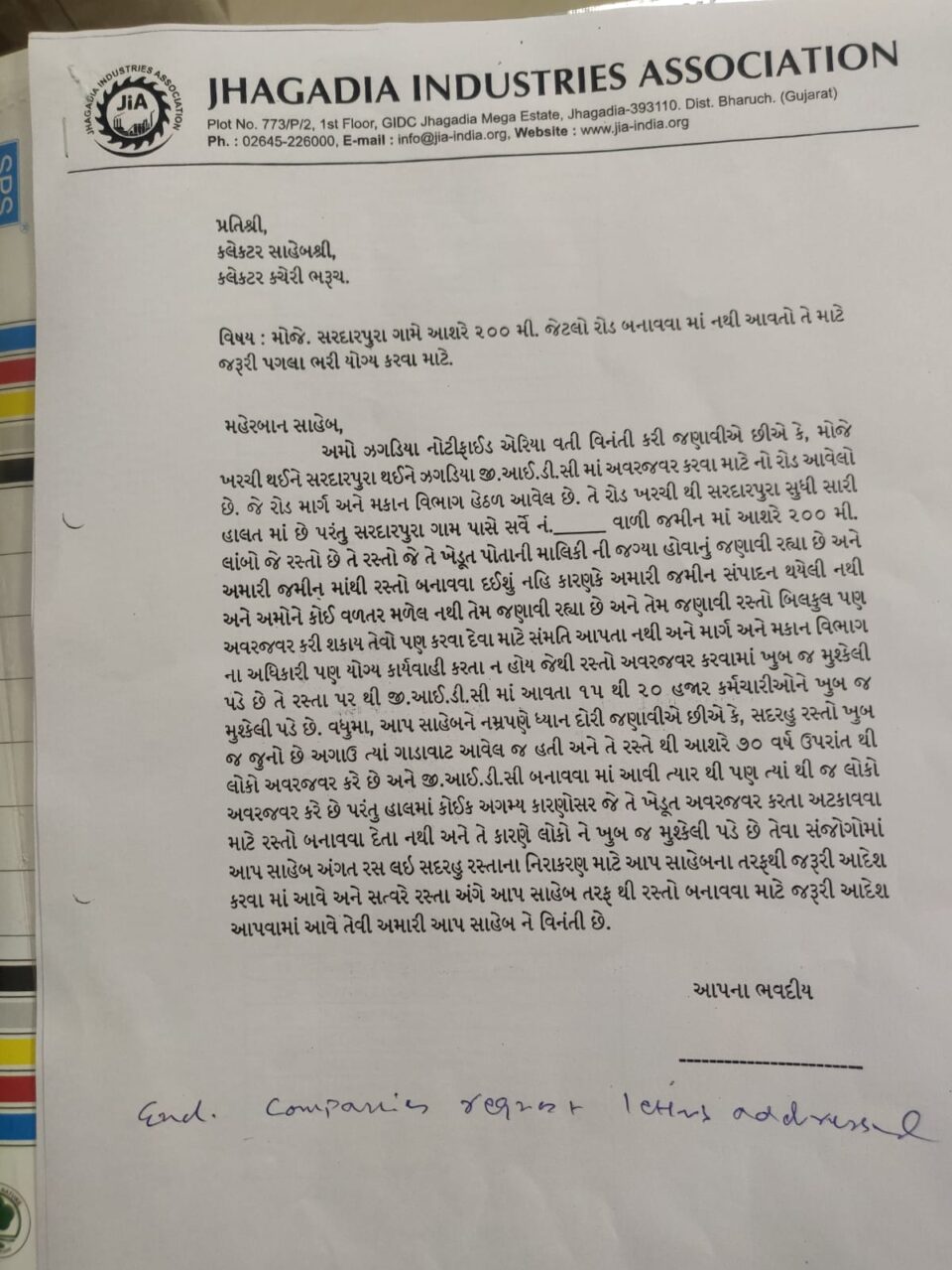 આ લેખિત રજૂઆતમાં ઝઘડીયા જીઆઇડીસીના હોદ્દેદારોએ જણાવ્યું છે કે, અમો ઝઘડિયા વિસ્તારના નોટિફાઇડ એરિયામાં ખરચિ થી સરદારપુરા થઈ ઝઘડીયા જીઆઇડીસીમાં અવરજવર કરતા હોય છે, આ માર્ગ ઘણા લાંબા સમયથી બનાવવામાં આવ્યો નથી માર્ગ અને મકાન વિભાગને પણ અનેક વખત લેખિત તથા મૌખિક રજૂઆતો કરવામાં આવેલ છે તેમ છતાં આ માર્ગનું નવીનીકરણ કરાયું નથી અંદાજિત દૈનિક અહીંથી 20,000 જેટલા જીઆઇડીસી માં કામકાજ કરતા લોકો અવરજવર કરતા રહે છે આ માર્ગ અત્યંત જુનો માર્ગ છે આપ સાહેબને ધ્યાન દોરીને જણાવવાનું છે કે આ માર્ગ આશરે 70 વર્ષથી વધુ જૂનો માર્ગ છે, અહીંથી અનેક રાહદારીઓ દિવસ દરમિયાન નીકળતા હોય છે તે તમામને આ કાચા રસ્તાથી ભારે હલાકીનો સામનો કરવો પડે છે અમુક ખેડૂતો દ્વારા અહીંથી અવરજવર અટકાવવા માટે માર્ગ નું નવીનીકરણ ન થાય તે માટે પણ પ્રયત્નો હાથ ધરવામાં આવ્યા છે ઉપરાંત આ વિસ્તારના ખેડૂતોનું જણાવવું છે કે અમારી જમીનો સંપાદિત કરવામાં આવેલ નથી. અમને જમીન સંપાદનનું વળતરનું ચુકવણું પણ કરાયું નથી આથી આ માર્ગ ખેડૂતો દ્વારા બનાવવા દેવામાં આવશે નહીં તેવી પણ અવારનવાર ખેડૂતો દ્વારા કહેવામાં આવે છે આથી જીઆઇડીસી ના હોદ્દેદારોએ કલેક્ટર સમક્ષ અંગત રસ લઈ આ માર્ગનું નવીનીકરણ અને નિરાકરણ કરવામાં આવે તેવી માંગ કરી છે.