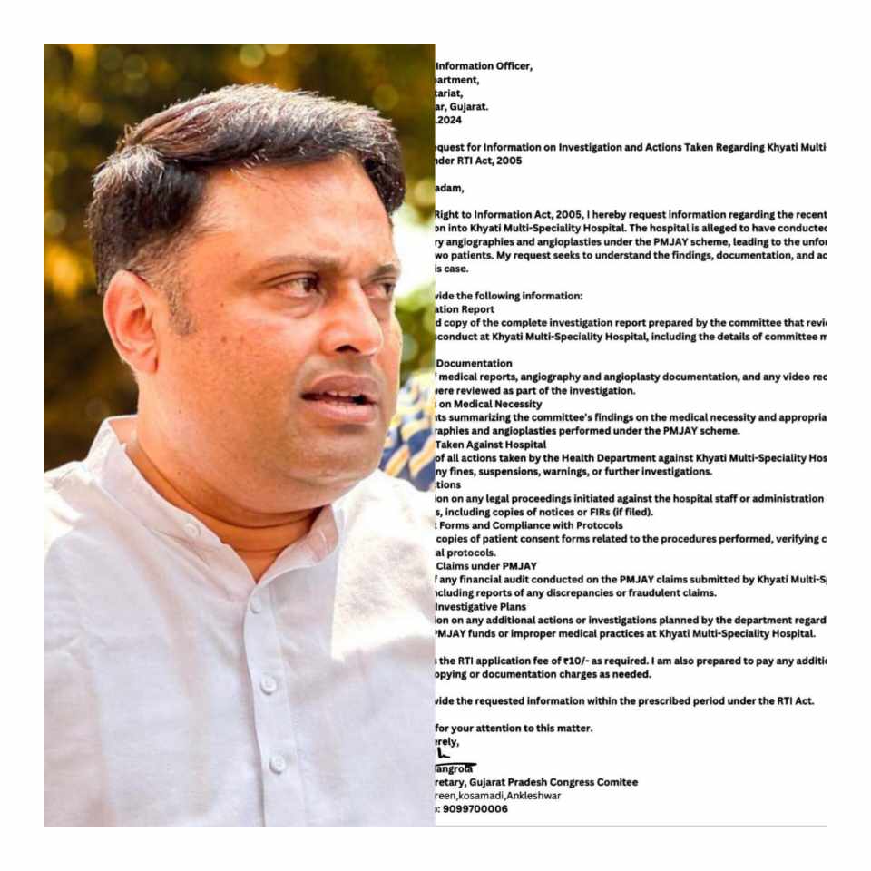 આરટીઆઈ માં સંદીપ માંગરોળ એ જણાવ્યું છે કે તપાસનો સંપૂર્ણ અહેવાલ જેમાં આયોજિત બિનજરૂરી પ્રોસેસ્યોર અંગેના તારણોનો સમાવેશ થાય તેમ જ તબીબી રેકોર્ડ્સ અને દસ્તાવેજોની પ્રમાણિત નકલ ખ્યાતિ મલ્ટી સ્પેશિયાલિટી હોસ્પિટલ સામે કરવામાં આવેલ પગલાંઓની વિગત જેમાં કાનૂની કાર્યવાહીનો પણ સમાવેશ કરવામાં આવ્યો છે સરકારની પીએમજેવાય માર્ગદર્શિકા ના પાલન માટેની ચકાસણી સહિતના મુદ્દા ઉપર સંદીપભાઈ માંગરોલાએ આરટીઆઇ કરી છે વધુમાં તેઓએ જણાવ્યું છે કે આપણા નાગરિકોના આરોગ્ય અને સલામતીની ઉપેક્ષા કરી શકાય તેમ નથી સરકારની પીએમજેવાય યોજના એવી અપેક્ષા સાથે બનાવવામાં આવી હતી કે જરૂરિયાતમંદ દર્દીઓ આ યોજના દ્વારા યોગ્ય સારવાર મેળવી શકે પરંતુ સમગ્ર મામલે ડોક્ટરો પોતાના અંગત લાભ માટે આ યોજનાનો ઉપયોગ કરતા હોય તેવું જાણવા મળ્યું છે આથી આરોગ્ય વિભાગ દ્વારા સંબંધિત સંકળાયેલા લોકોની તાત્કાલિક અસરથી તપાસ કરી તારણ જાહેર કરે અને જવાબદાર સરકારના અધિકારીઓ અને હોસ્પિટલના સંચાલકો સામે યોગ્ય કાર્યવાહી કરવાની માંગ કરેલ છે.