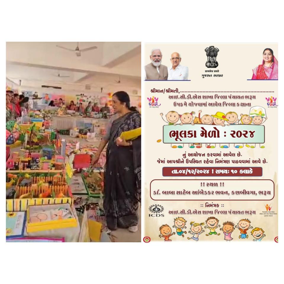 ભરૂચ જિલ્લા પંચાયત ની આઇસીડીએસ શાખા દ્વારા ભૂલકા મેળો 2024 નું ડો.બાબા સાહેબ આંબેડકર ભવન કણબીવગા ભરૂચ ખાતે આયોજન કરવામાં આવ્યું હતું , આંગણવાડી કેન્દ્રના ઇન્ચાર્જ સીડીપીઓ તથા કાર્યકર બહેનો અને તેડાગર બહેનો દ્વારા સમગ્ર કાર્યક્રમ નું સુંદર સંચાલન કરવામાં આવ્યું હતું, ભરૂચ જિલ્લા અંતર્ગત સમાવિષ્ટ કુલ 12 ઘટક અંતર્ગત 1374 આંગણવાડીના બાળકોએ આ ભૂલકા મેળામાં ભાગ લીધો હતો, જિલ્લા પંચાયત આઈસીડીએસ અંતર્ગત ચાલતી પાપા પગલી યોજના માં સમાવિષ્ટ પૂર્વ પ્રાથમિક શિક્ષણ જે બાળકો મેળવી રહ્યા હોય છે, તે તમામ બાળકો ઉપસ્થિત રહી વિવિધ કલાકૃતિઓ તેમજ સાંસ્કૃતિક કાર્યક્રમ રજૂ કર્યો હતો ,આ કાર્યક્રમને પ્રોત્સાહન આપવા માટે જિલ્લા શિક્ષણ અધિકારી તેમજ શિક્ષણ જગત સાથે જોડાયેલા આગેવાનો ઉપસ્થિત રહ્યા હતા.