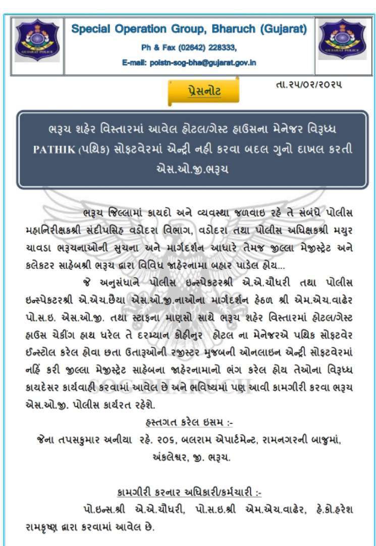 ભરૂચ જિલ્લામાં કાયદો અને વ્યવસ્થા સમગ્રપણે જળવાઈ રહે તે માટે જિલ્લા પોલીસ અધિક્ષક મયુર ચાવડા ની સૂચના અનુસાર જિલ્લા મેજિસ્ટ્રેટ કલેકટરના જાહેરનામાનો ભંગ કરનાર હોટલ ગેસ્ટ હાઉસની ચેકિંગ કામગીરી હાથ ધરવામાં આવી હોય જેમાં જુદા જુદા વિસ્તારોમાં એસ.ઓ.જી. ની ટીમ દ્વારા કામગીરી હાથ ધરાયેલો હોય જે દરમિયાન હોટલ ગેસ્ટ હાઉસ વગેરે ચેક કરતા કોહિનૂર હોટલ દ્વારા પથિક સોફ્ટવેર ઇન્સ્ટોલ કર્યો હોવા છતાં આવા ગમન કરતા ઉતરનાર ની રજીસ્ટર મુજબની ઓનલાઇન એન્ટ્રી સોફ્ટવેરમાં કરવામાં આવી ન હોય જે તમામ બાબતો ધ્યાને આવતા જિલ્લા મેજિસ્ટ્રેટ ના જાહેરનામાનો ભંગ કર્યો હોય જે સબબ કાયદેસરની કાર્યવાહી કરી હોટલના મેનેજર જેના તપસ કુમાર અનિયા રહે 206 બલરામ એપાર્ટમેન્ટ રામનગર ની બાજુમાં અંકલેશ્વર જીલ્લો ભરૂચ ને હસ્તગત કરી કાયદેસરની કાર્યવાહી હાથ ધરેલ છે, આગામી સમયમાં પણ હોટલ ગેસ્ટ હાઉસના માલિકો પર આ કામગીરી યથાવત રહેશે તેમ એસોજી પોલીસે જણાવ્યું છે.