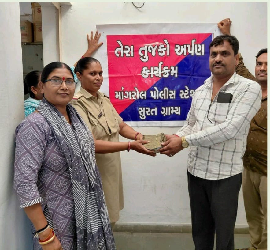 વાંકલ :: માંગરોળ તાલુકા મથકે માંગરોળ પોલીસ સ્ટેશન દ્વારા તેરા તુજકો અર્પણ નો કાર્યકમ એમ એચ સોલંકી ના અધ્યક્ષ સ્થાને યોજાયો હતો. મોસાલી ચારરસ્તા ખાતે રામદેવ કરિયાણા સ્ટોર માંથી સાડા ચાર લાખ ના રોકડ રકમ ની ચોરી થઈ હતી તે ગુનો એલ.સી.બી.શાખા સુરતગ્રામ્ય એ ગુનાનું ડિટેક્શન કરી ચાર લાખ રૂપિયા મુદ્દામાલ માંગરોળ પોલીસ ને સુપરત કર્યા હતા.આ મુદ્દામાલ મૂળ માલિકને અર્પણ કરાયા હતા.પોલીસ સ્ટાફગણ હાજર રહ્યો હતો.