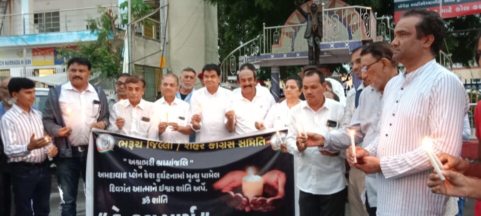 ભરૂચ જિલ્લા-શહેર કોંંગ્રેસ સમિતી દ્વારા ભરૂચ શહેરના રેલવે સ્ટેશન સર્કલ પાસે ડો. બાબાસાહેબ આંબેડકરની પ્રતિમા નજીક અશ્રુભરી શ્રદ્ધાંજલીનો કાર્યક્રમ રાખ્યો હતો. જેમાં જિલ્લા કોંગ્રેસ પ્રમુખ રાજેન્દ્રસિંહ રણા, નાઝૂ ફડવાલા, સમસાદ અલી સૈયદ, હેમેન્દ્ર કોઠીવાલા, સલીમ અમદાવાદી, સહિતના આગેવાનો હાજર રહ્યાં હતાં. આગેવાનોએ કેન્ડલ માર્ચ યોજી મૃતકની આત્માને ઇશ્વર શાંતી અર્પે તેમજ તેમના પરિવારજનોને આ દુ:ખ સહન કરવાની શક્તિ આપે તેવી પ્રભુને પ્રાર્થના કરી હતી.