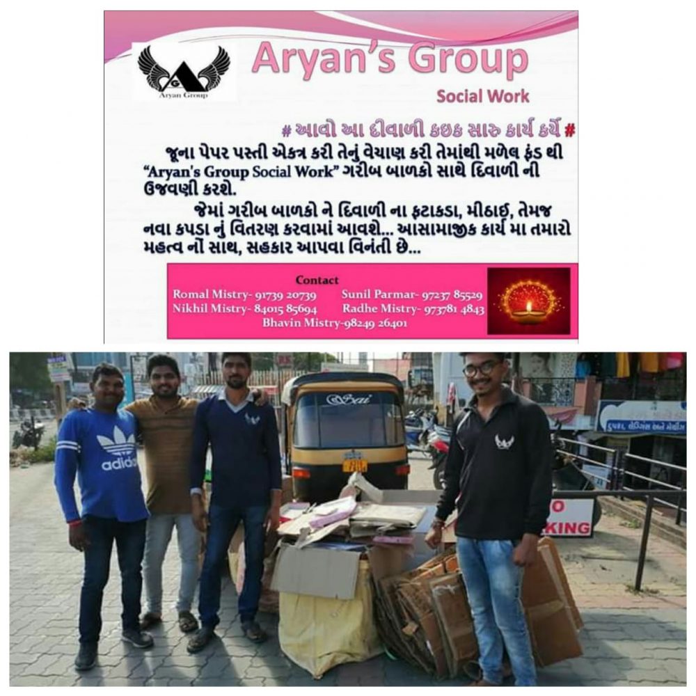 ભરૂચના આર્યન ગ્રૂપ દ્વારા અનોખી રીતે દિવાળીની ઉજવણી કરવાનું નક્કી કરીને કંઈક સારું કાર્ય કરવાની ભાવના સાથે ગરીબ બાળકોને ફટાકડા, મીઠાઇ તેમજ નવા કપડાનું વિતરણ કરવાનું નક્કી કરેલ છે. જે અંગેનું ફંડ એકત્રિત કરવા આ ગ્રૂપ જૂના પેપર એકત્રિત કરી તેનું વેચાણ કરી તેમાંથી મળેલ ફંડથી ગરીબ બાળકો સાથે દિવાળીની ઉજવણી કરશે અને તમામ લોકોને સાથ સહકાર આપવા આ ગ્રૂપ દ્વારા અપીલ કરવામાં આવી છે.