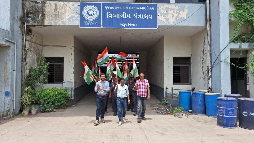 ભરૂચ એસ.ટી. વિભાગ દ્વારા ‘હર ઘર તિરંગા’ અભિયાન અંતર્ગત ભવ્ય રેલીનું આયોજન કરવામાં આવ્યું હતું. રેલી વિભાગીય યંત્રાલયથી શરૂ થઈ વિભાગીય કચેરી, ભોલાવ અને ભોલાવ બસ સ્ટેશન સુધી પહોંચી હતી. એસ.ટી. કર્મચારીઓએ મુસાફરો અને સ્થાનિક નાગરિકોમાં તિરંગા પ્રત્યે ગર્વની ભાવના જગાવી તેમજ ઘરો ઉપર તિરંગો ફરકાવવાની અપીલ કરી.આ કાર્યક્રમના અંતે ‘વ્યસન મુક્ત ભારત’ અભિયાન અંતર્ગત તમામ કર્મચારીઓએ વ્યસનમુક્તિ માટે પ્રતિજ્ઞા લીધી. આ અવસરે વિભાગીય નિયામક આર.પી. શ્રીમાળી, વિભાગીય પરિવહન અધિકારી સોલંકી, ડેપો મેનેજર વી.આર. છત્રીવાલા સહિત યંત્રાલય, કચેરી અને ભોલાવ બસ સ્ટેશનના કર્મચારીગણની હાજરી રહી.