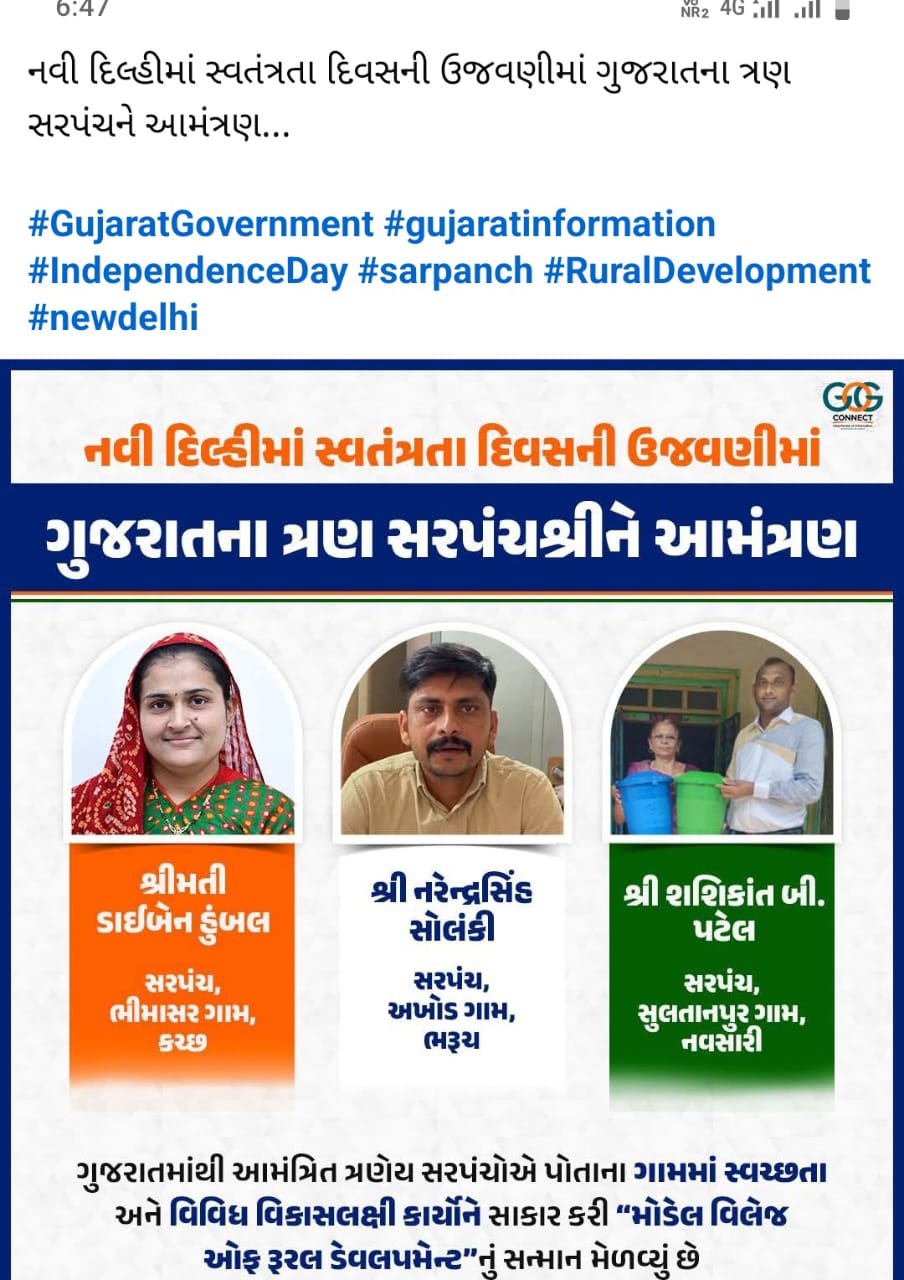ભરૂચ જિલ્લામાં ઓડીએફ પ્લસ મોડેલ ગામમાં સારું કામ કરીને ગામને સ્વચ્છ બનાવી રહ્યા છે. જેને લઈને ગુજરાત રાજયમાંથી ૩ સરપંચની પસંદગી કરવામાં આવી છે. જે દિલ્હી લાલ કિલ્લા ખાતે યોજાનાર સ્વતંત્રતા દિવસના સમારોહમાં હાજરી આપશે. જેમાં ભરૂચ જિલ્લાના અખોડ ગામના સરપંચ નરેન્દ્ર સોલંકી ને સ્વતંત્રતા દિવસના સમારોહમાં ડીડી ડબલ્યુ ખાસ મહેમાન તરીકે હાજરી આપવામાં માટે આમંત્રણ આપ્યું છે. જે દિલ્હી લાલ કિલ્લા ખાતે યોજાનાર સ્વતંત્રતા દિવસના સમારોહમાં હાજરી આપશે.