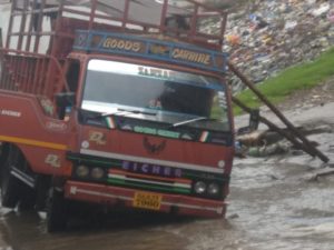 આજ રોજ સવાર થી ભરૂચ શહેર માં ઝરમર વરસાદી માહોલ જામ્યો હતો..જેના કારણે રસ્તા પર પાણી ભરાવવા ની સમસ્યા સર્જાય હતી…ભરૂચ ના ફાટા તળાવ નજીક આવેલ ધોબીવાડ ના નાકા પાસે વરસાદી પાણી ના કારણે પડેલ ખાડા માં એક આઇસર ટેમ્પો ફસાયો હતો..ટેમ્પો ફસાતા રસ્તા ઉપર થી પસાર થતા અન્ય વાહન ચાલકો ને મુશ્કેલીઓનો સામનો કરવો પડયો હતો.. તો બીજી તરફ પાલિકા નું વાહન પણ ખાડાઓમાં ફસાયેલું નજરે પડ્યું હતું..