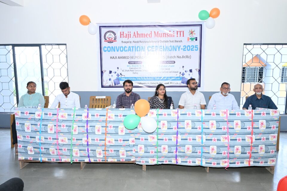 મુન્શી મનુબરવાલા મેમોરીયલ ચેરીટેબલ ટ્રસ્ટ સંચાલિત હાજી અહમદ મુન્શી આઈ .ટી.આઈ. માં convocation ceremony નો પ્રોગ્રામ રાખવા માં આવ્યો હતો .આ પ્રોગ્રામ માનનીય વડાપ્રધાન શ્રી નરેન્દ્ર મોદી સાહેબના જન્મદિવસની ઉજવણી જેને વિશ્વ કર્મા દિવસ તરીકે ઉજવવામાં આવે છે તેના ભાગરૂપે આ પ્રોગ્રામ રાખવામાં આવ્યો હતો. પ્રોગ્રામમાં મુખ્ય અતિથિ તરીકે VC શાહ પટેલ સર્વિસ લિમિટેડ દહેજના Executive HR ,દ્રષ્ટિ પટેલ મેડમ , કલરટેક્સ કંપની, વિલાયતના પ્રોડકશન મેનેજર વિરલ પ્રજાપતિ સાહેબ તેમજ HR Executive કિર્તિરાજ ડાભી સાહેબ,ટ્રસ્ટના ટ્રસ્ટી જનાબ યુનુસભાઈ પટેલ સાહેબ,જનાબ નિસાર સાહેબ,ટ્રસ્ટના એડ્મિન આરીફ સાહેબ,ઇન્ચાર્જ આચાર્યશ્રી,સ્ટાફમિત્રો અને તાલીમાથીઓ હાજાર રહ્યા હતાં.
