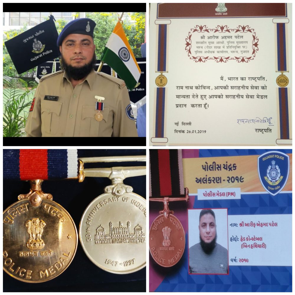 અમદાવાદના જીએમડીસી ગ્રાઉન્ડમાં આજે યોજાયેલા સમારોહમાં ભરૂચ જીલ્લા પોલીસ અધિક્ષકશ્રીની કચેરીએ રીડર શાખામાં ફરજ બજાવતાં આરીફ અહમદ પટેલ રહે. દહેગામ તા.જી. ભરૂચનાઓને પ્રશંસનીય સેવા પોલીસ મેડલથી સન્માનિત કરવામાં આવ્યા હતા. ભરૂચ જીલ્લાના કાર્યદક્ષ પોલીસ કર્મચારીને મળેલા આ સન્માનથી શહેર પોલીસ બેડામાં ગૌરવની લાગણી ફેલાઇ જવા પામી હતી.માન.મુખ્યમંત્રી વિજય રૂપાણી દ્વારા મેડલ આપી સન્માનિત કરવામાં આવ્યા હતા અને તેમની કામગીરીને બીરદાવવામાં આવી હતી.અમદાવાદમાં જીએમડીસી ગ્રાઉન્ડમાં ક્નવેન્શન હોલમાં યોજાયેલા સમારોહમાં વર્ષ 2014 થી 2019 દરમિયાન ગણતંત્ર દિવસ અને સ્વાતંત્ર્ય દિવસ નિમિતે જાહેર થયેલા વિશિષ્ટ સેવા માટેના પોલીસ મેડલ્સ મુખ્યમંત્રી દ્વારા એનાયત કરવામાં આવ્યા હતા. મુખ્યમંત્રી વિજય રૂપાણી દ્વારા ગુજરાત પોલીસ દળના 168 પોલીસ કર્મીઓ-અધિકારીઓને પોલીસ મેડલ્સથી સન્માનિત કરવામાં આવ્યા હતા. મુખ્યમંત્રી અને ગૃહમંત્રી પ્રદીપસિંહ જાડેજાની ઉપસ્થિતિમાં યોજાયેલા આ સમારોહમાં રાષ્ટ્રપતિ પોલીસ સેવા પદકથી સન્માનિત ભરૂચ જીલ્લા પોલીસ અધિક્ષકશ્રીની કચેરીએ રીડર શાખામાં ફરજ બજાવતાં આરીફ અહમદ પટેલ રહે. દહેગામ તા.જી. ભરૂચનાઓને પોલીસ મેડલ્સ આપવામાં આવ્યા હતા. આ સમારોહમાં મુખ્ય સચિવ ડો.જે.એન.સિંહ, ગૃહના અધિક મુખ્ય સચિવ સંગીતાસિંઘ, રાજય પોલીસ વડા શિવાનંદ ઝા તેમજ વરિષ્ઠ પોલીસ અધિકારી અને મેડલ પ્રાપ્ત કરનાર પોલીસ અધિકારી-કર્મચારી તેમજ તેમના પરિવારજનો ઉપસ્થિત રહ્યા હતા.