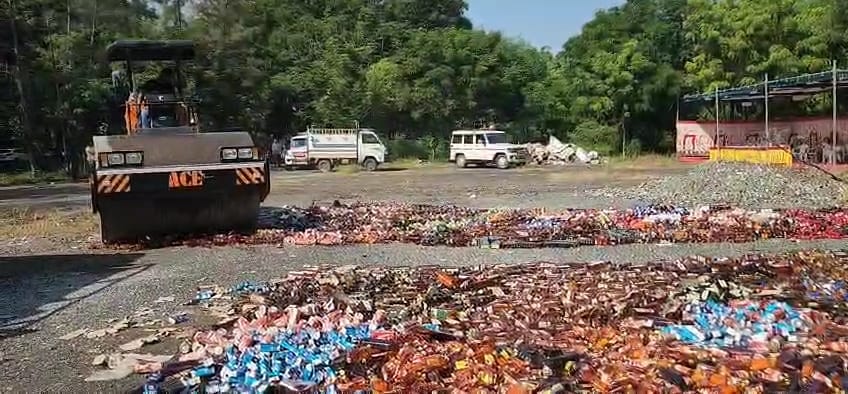 ભરૂચ ડિવિઝનના ૮ પોલીસ સ્ટેશનના ૨૫૫ કેસમાં ઝડપાયેલાં ૧.૫૮ કરોડના દારૂની બોટલ પર બુલડોઝર ફેરવાયું