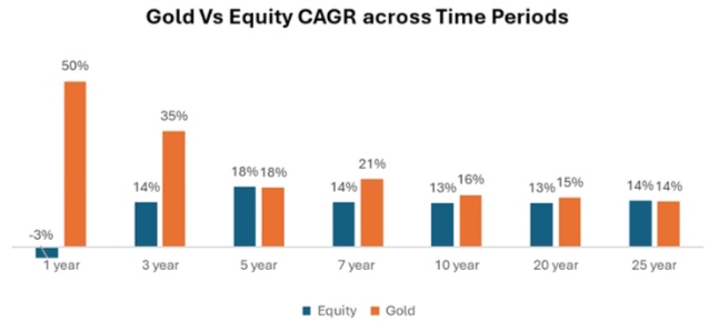 સ્ત્રોતઃ વર્લ્ડ ગોલ્ડ કાઉન્સિલ, એમએફાઈ, નિફ્ટી 50 ટીઆરઆઈ વિ. ભારતીય રૂપિયામાં સોનાની કિંમતો, 30 સપ્ટેમ્બર 2025ના ડેટા મુજબ