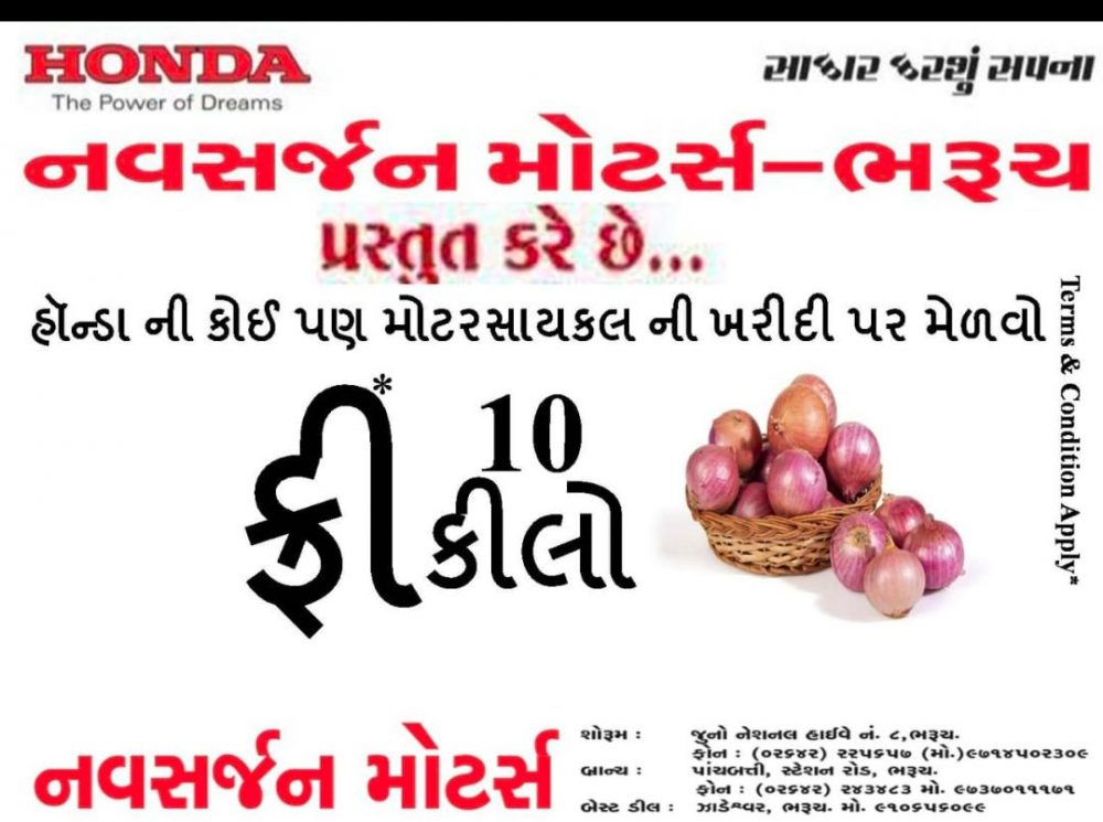 ભરૂચ જિલ્લામાં હવે મોબાઇલ અને બાઈકમાં ખરીદી કરો તો અમુક કિલો કાંદા એટલે કે ગરીબોની કસ્તૂરી ડુંગળીની ઓફર કરતી જાહેરાત થઇ રહી છે.