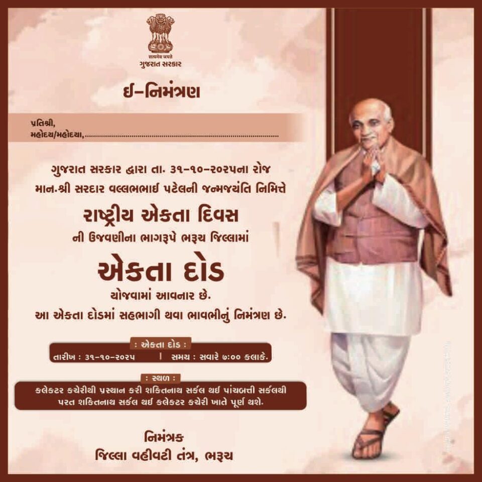 લોહપુરુષ સરદાર વલ્લભભાઈ પટેલની જન્મજયંતિ નિમિતે ભારતમાં દર વર્ષે તા.૩૧ ઓક્ટોબરે રાષ્ટ્રીય એકતા દિવસ ઉજવવામાં આવે છે.આ વર્ષે સરદાર વલ્લભભાઈ પટેલની ૧૫૦મી જન્મજયંતિના ભાગરૂપે ભરૂચ જિલ્લા વહીવટીતંત્ર દ્વારા “રન ફોર યુનિટી-૨૦૨૫” કાર્યક્રમનું આયોજન કરવામાં આવ્યું છે૩૧ ઑક્ટોબર, ૨૦૨૫ના રોજ, શુક્રવારના દિવસે, સવારે ૭:૦૦ વાગ્યે યોજાશે. “રન ફોર યુનિટી કાર્યક્રમનો પ્રારંભ કલેક્ટર કચેરી, ભરૂચથી થશે, જે શક્તિનાથ સર્કલ – પંચબત્તી સર્કલ થઈને ફરી કલેક્ટર કચેરી ખાતે સમાપ્ત થશે. તેમજ સરદાર વલ્લભભાઈ પટેલની જન્મ જયંતી નિમિત્તે “રાષ્ટ્રીય એકતા દિવસ” તરીકે ઉજવવા તથા પ્રતિજ્ઞા લેવામાં આવનાર છે. આ રાષ્ટ્રીય કાર્યક્રમમાં પદાધિકારીઓ, અધિકારીઓ, કર્મચારીઓ, ખેલાડીઓ, એનસીસી કેડેટ્સ, હોમગાર્ડસ, શાળાના વિદ્યાર્થીઓ, ભરૂચવાસીઓ તેમજ સર્વ રાષ્ટ્રપ્રેમી પ્રજાજન સહભાગી થાય તેમ જિલ્લા વહીવટીતંત્ર દ્વારા અનુરોધ કરવામાં આવ્યો છે.