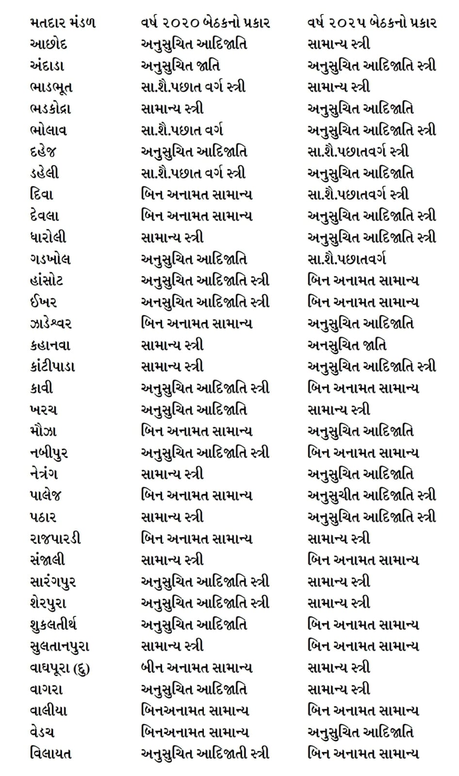 ઝઘડિયાની ૪ પૈકી ૩ બેઠકો સામાન્ય કરી દીધી ઝઘડિયા તાલુકો આદિવાસી બાહુલ વસ્તી ધરાવતો તાલુકો છે. ઉપરાંત તે પેસા એક્ટ હેઠળ આવતો હોવાથી ત્યાં આદિવાસી સમાજને પ્રાધાન્ય મળે તે રીતે તેમને સીટ ફાળવવાની થતી હોય છે. જોકે, તેના બદલે ચાર પૈકી ૩ બેઠકો સામાન્ય કરી દેવાઈ છે. જેમાં ધારોલીની એક સીટ માત્ર અનસૂચિત આદિજાતી સ્ત્રીને મળી છે. જયારે અન્ય બેઠકો જેમાં રાજપારડીમાં સામાન્ય સ્ત્રી. સુલતાનપુરામાં બીન અનામત સામાન્ય અને વાઘપુરા(દુ)માં સામાન્ય સ્ત્રીની સીટ ફળવાઈ છે.