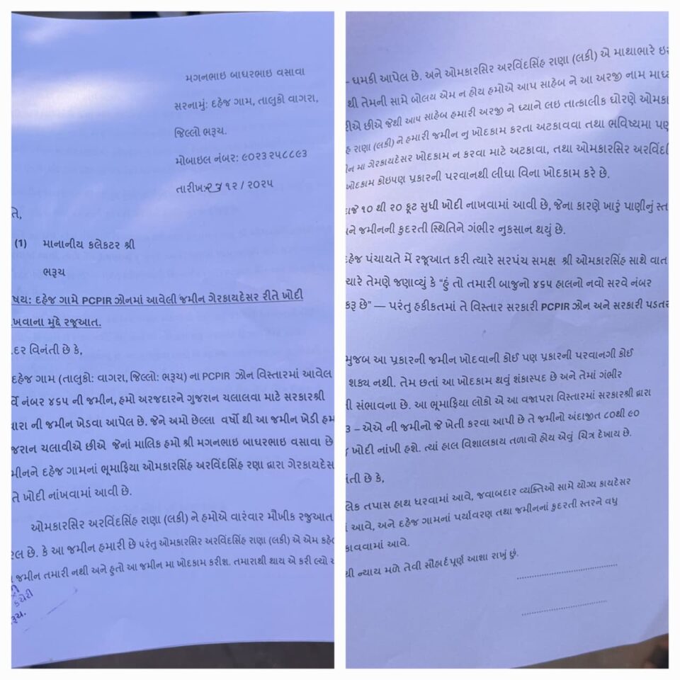 વાગરા તાલુકાના દહેજ ગામે રહેતાં મગનભાઈ વસાવાએ ભરૂચ જિલ્લા કલેક્ટરને લેખિતમાં આવેદન પત્ર આપી રજૂઆત કરી છે. જેમાં તેમણે આક્ષેપ કર્યા છે કે, તેઓને સરકાર દ્વારા ગુજરાન ચલાવવા જમીન ખેડવા આપી હતી. જેમાં તેઓ છેલ્લાં કેટલાંય વર્ષોથી જમીન ખેડી પરિવારનું ગુજરાન ચલાવી રહ્યાં છે. જોકે, ઘોડા વર્ષોથી તે જમીન પર દહેજ ગામના જ ભુમાફિયા ઓમકારસિંહ અરવિંદસિંહ રણા (લકી) દ્વારા ગેરકાયદે રીતે ખોદકામ કરવામાં આવ્યું છે. તેઓએ ઉમેર્યું હતું કે, તેઓએ અનેકવાર ઓમકારસિંહ રણા (લકી)ને મૌખિક રીતે જાણ કરી તે જમીન તેમની હોવાનું જણાવવા છતાં લકી એટલે કે ઓમકારસિંહ રણાએ તેમને તે જમીન તમારી નથી એટલે હું તો ત્યાં ખોદકામ કરીશ જ, તમારાથી જે થાય તે કરી લો તેવી ધમકીઓ આપી હતી. અરજીમાં તેમણે વધુમાં નોંધ્યું હતું કે, ઓમકારસિંહ રણા (લકી) એ માથાભારે શખ્સ હોવાધી તેમની સામે તેઓ બોલી શકે તેમ ન હોવાથી તેમણે કલેક્ટરને મામલામાં કાયદાકિય કાર્યવાહી કરી તાત્કાલિક ધોરણે તેમની જમીન પર થતું ખોદકામ અપટકાવે તેવી માગ કરી હતી.