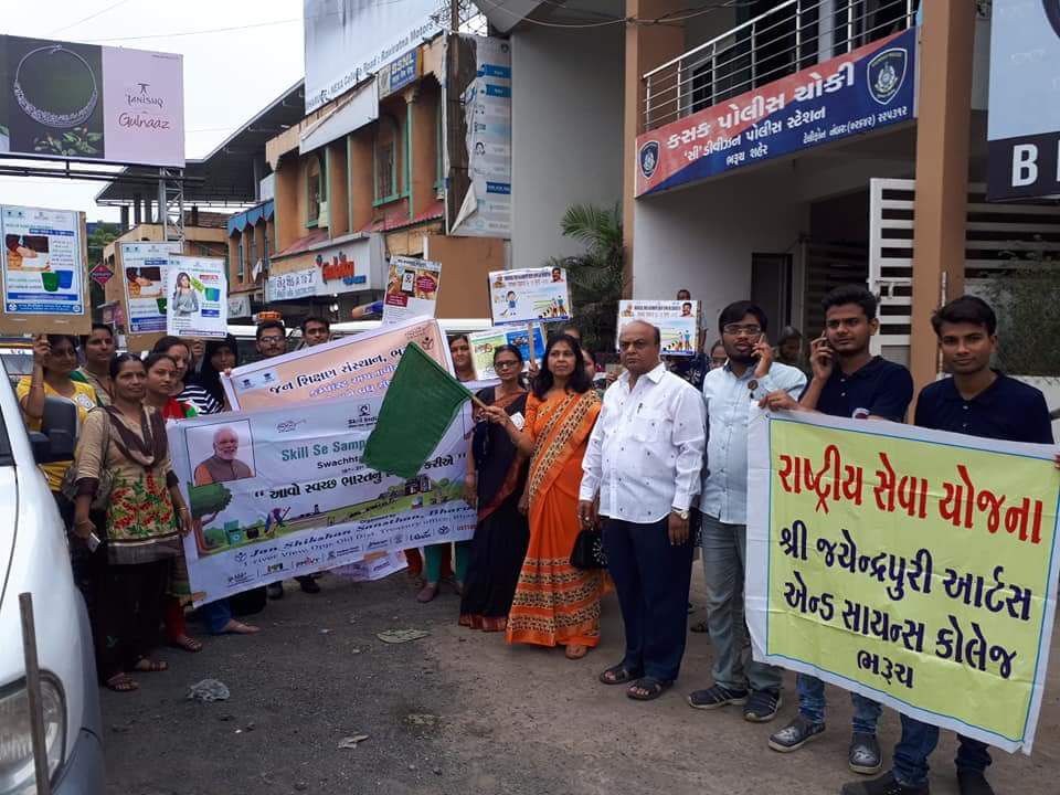 ભરૂચ જન શિક્ષણ સંસ્થા અને જ્યેન્દ્રપુરી આર્ટ્સ એન્ડ સાયન્સ કોલેજ ના વિદ્યાર્થીઓ દ્વારા શરૂ થતાં સ્વચ્છતા અભિયાન અંતર્ગત ભરૂચ ના કસક સર્કલ ખાતે થી એક રેલી નું આયોજન કરવામાં આવ્યું હતું.જેમાં ભરૂચ નગર પાલિકાના પ્રમુખ સુરભી બેન તંબાકુવાલા.સ્થાનિક પાલિકા સભ્ય વિજય કોન્ટ્રાક્ટર સહિત ના મહાનુભાવો ની ઉપસ્થિતિમાં રેલી ને ફ્લેગ આપી પ્રસ્થાન કરવામાં આવી હતી. આ પ્રસંગે મોટી સંખ્યામાં ભાઈઓ બહેનો તેમજ કોલેજ ના વિદ્યાર્થીઓ સ્વચ્છતા અંગે ના વિવિધ સ્લોગન વારા બેનરો સાથે રેલી માં જોડાયા હતા….