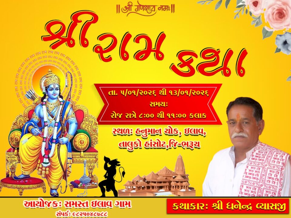 ભરૂચના હાંસોટ તાલુકાના ઇલાવ ગામે તારીખ 5 થી 13 જાન્યુઆરી દરમ્યાન સંગીતમય શ્રી રામ ચરિત માનસ કથાનું આયોજન કરવામાં આવ્યું છે જેમાં કથાકાર શ્રી ધનેન્દ્ર વ્યાસ અમૃતમય વાણીમાં કથાનું રસપાન કરાવશે.