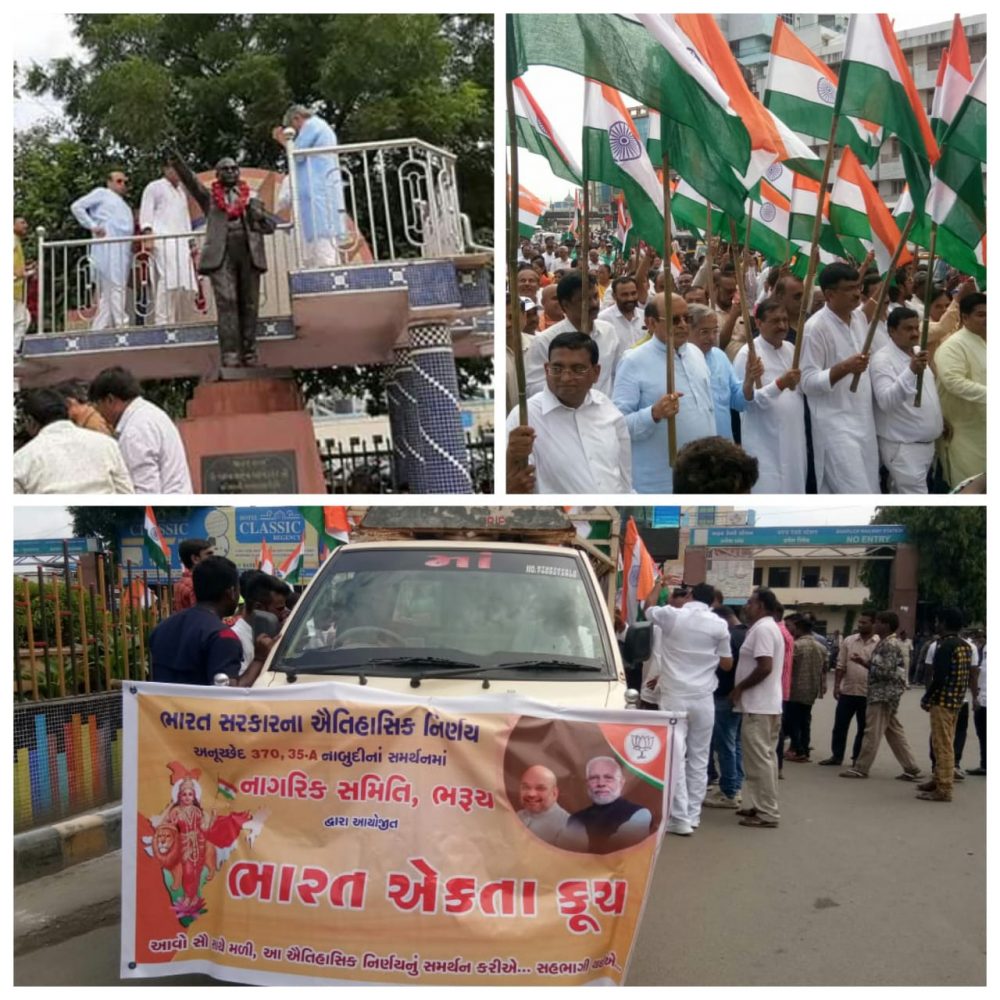 ભારત સરકારના ઐતિહાસિક નિર્ણય અનુચ્છેદ 370 તેમજ 359 નાબૂદીનાં સમર્થનમાં આજરોજ નાગરિક સમિતિ ભરૂચ દ્વારા એક ‘ભારત એકતા કૂચ’ નું આયોજન કરવામાં આવ્યું.