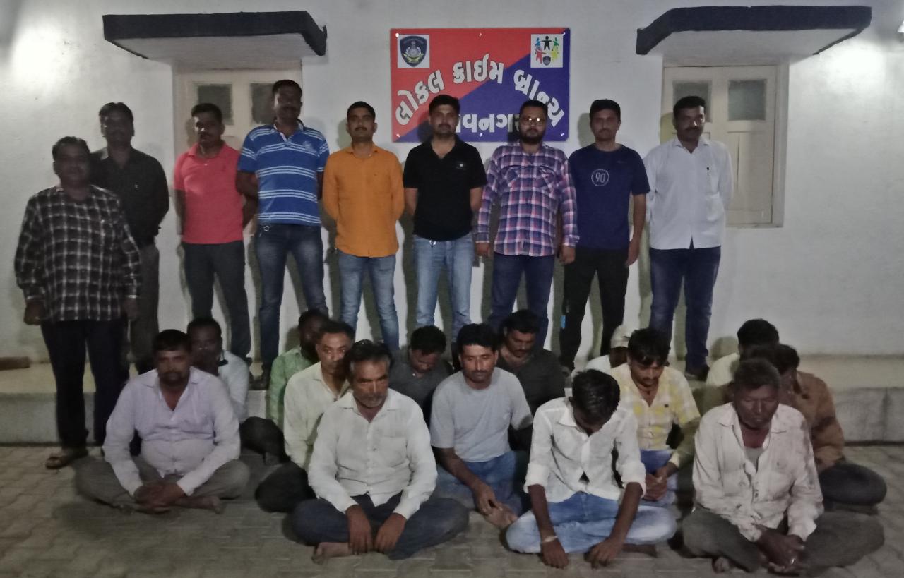 જાહેરમાં ગોળ કુંડાળું વળી ગંજીપતાનાં પાના-પૈસા વતી હાથ કાપનો મોબાઇલની લાઇટનાં અંજવાળે જુગાર રમતાં નીચે મુજબનાં કુલ-૧૪ માણસો પકડાય ગયેલ અને ઘણાં માણસો જુગાર રમવાવાળી જગ્યાએથી ભાગી ગયેલ.જે પકડાય ગયેલ નીચે મુજબનાં માણસો પાસેથી ગંજીપતાનાં પાના-૫૨ કિ.રૂ.૦૦/-, રોકડ રૂ.૮૯,૦૫૦/-,મોબાઇલ નંગ-૧૫ કિ.રૂ.૪૪,૫૦૦/- તથા અલગ-અલગ કંપનીનાં મો.સા./સ્કુટર નંગ-૨૩કિ.રૂ.૫,૮૫,૦૦૦/- મળી કુલ રૂ.૭,૧૮,૫૫૦/- નો મુદ્દામાલ કબ્જે કરવામાં આવેલ તેમજ ભાગી ગયેલ માણસોને ઝડપી પાડવા તજવીજ હાથ ધરવામાં આવેલ છે.આ તમામ વિરુદ્ધ શિહોર પોલીસ સ્ટેશનમાં જુગાર પ્રતિબંધક ધારા ની કલમ હેઠળ ગુન્હો દાખલ કરાવવામાં આવેલ.