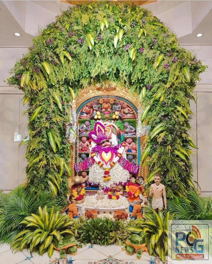 બોટાદ જિલ્લામાં આવેલા વિશ્વ વિખ્યાત અને આસ્થાના પ્રતિક એવા સાળંગપુર ગામે કષ્ટભંજનદેવ હનુમાનજીદાદાને આજે શનિવારના પવિત્ર દિન નિમિત્તે મોગરો, ગુલાબ, સહિતના ફૂલોના દિવ્ય વાઘાનો શણગાર કરવામાં આવ્યો હતા. વન વિચરણના દર્શનની ઝાંખી કરાઈ શ્રી સ્વામિનારાયણ મંદિર વડતાલધામ સંચાલિત વિશ્વવિખ્યાત શ્રી કષ્ટભંજનદેવ હનુમાનજી મંદિરસાળંગપુરધામ ખાતે શનિવારના રોજ શાસ્ત્રી સ્વામી હરિપ્રકાશદાસજી (અથાણાવાળી)ની પ્રેરણાથી એવં કોઠારી વિવેકસાગરદાસ સ્વામીના માર્ગદર્શનથી કષ્ટભંજન દેવ હનુમાનજી દાદાને મોગરો, ગુલાબ વિગેરે ફૂલોના દિવ્ય વાઘાનો શણગાર કરવામાં આવ્યો હતો. તેમજ સવારે 5:30 કલાકે મંગળા આરતી પૂજારી સ્વામી દ્વારા કરવામાં આવી હતી. એવં દાદાના સિંહાસનને શણગાર કરવામાં આવેલ. સવારે 7:00 કલાકે શણગાર આરતી કોઠારી વિવેકસાગરદાસ સ્વામી દ્વારા કરવામાં આવેલ તથા અષાઢ સુદ 10 ના દિવસે શ્રી સ્વામિનારાયણ ભગવાનના વન વિચરણ કરવા ગયા હતાં તેના દર્શનની ઝાંખી કરાવવામાં આવી હતી. ભક્તોએ દર્શનનો લાભ લીધો દાદાના સિંહાસનને લાલ-પીળી ખારેકનો શણગાર કરવામાં આવ્યો હતો. દાદાના શણગારનો ભાવિકોએ રૂબરૂ દર્શન કરી ધન્યતા અનુભવી હતી. તેમજ દેશ-વિદેશમાં વસતા હરિભક્તોએ હનુમાનજીદાદાના શણગારના ઓનલાઈન દર્શનનો લાભ લઈ ધન્યતા અનુભવી હતી.