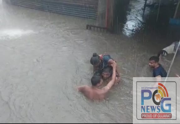 રાજયના અનેક જિલ્લામાં અનરાધાર મેહ વરસી રહ્યો છે. છોટાઉદેપુર જિલ્લામાં બોડેલી વિસ્તારમાં એક જ દિવસમાં ૨૨ ઇંચ વરસાદ થતા નદી નાળા છલકાઇ જવાના કારણે બોડેલી નગર સહિતના વિસ્તારમાં પુરની પરિસ્થિતિનું નિર્માણ થવા પામ્યું હતું. બોડેલી નગરમાં પાણી ફરી વળતા લોકોનો જીવ તાળવે ચોંટ્યો હતો. પરંતુ એ જ અરસામાં છોટાઉદેપુર જિલ્લા પોલીસના બોડેલી ખાતે ફરજ બજાવતા જાંબાઝ પોલીસ સબ ઇન્સ્પેકટર એ.એસ.સરવૈયાએ સમયસૂચકતા વાપરી કેડસમા ધસમસતા પાણીના પ્રવાહની પરવા કર્યા વગર પાણીમાં ફસાયેલા લોકોને બહાર કાઢવાની માવનતાભરી કામગીરી શરૂ કરી હતી.